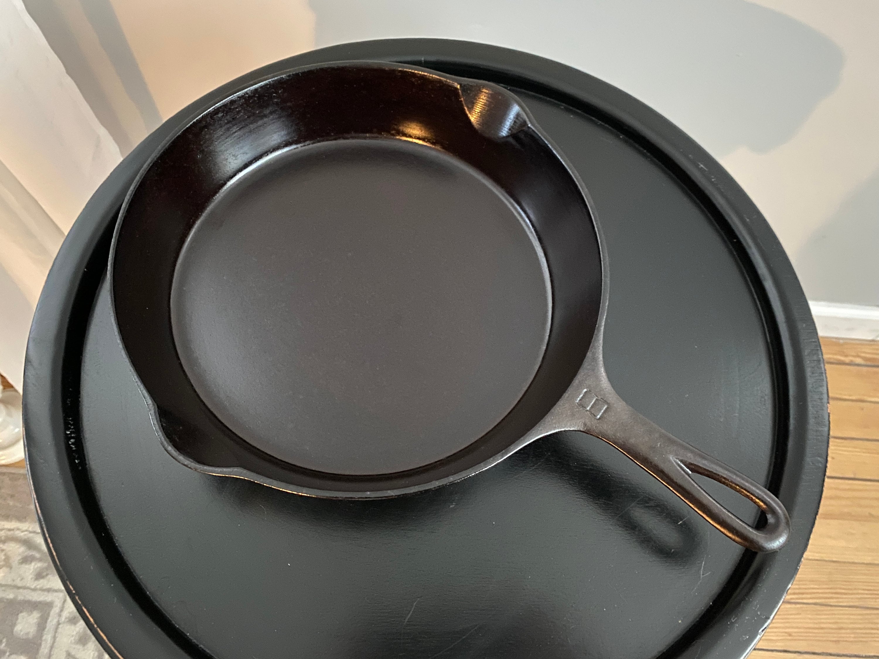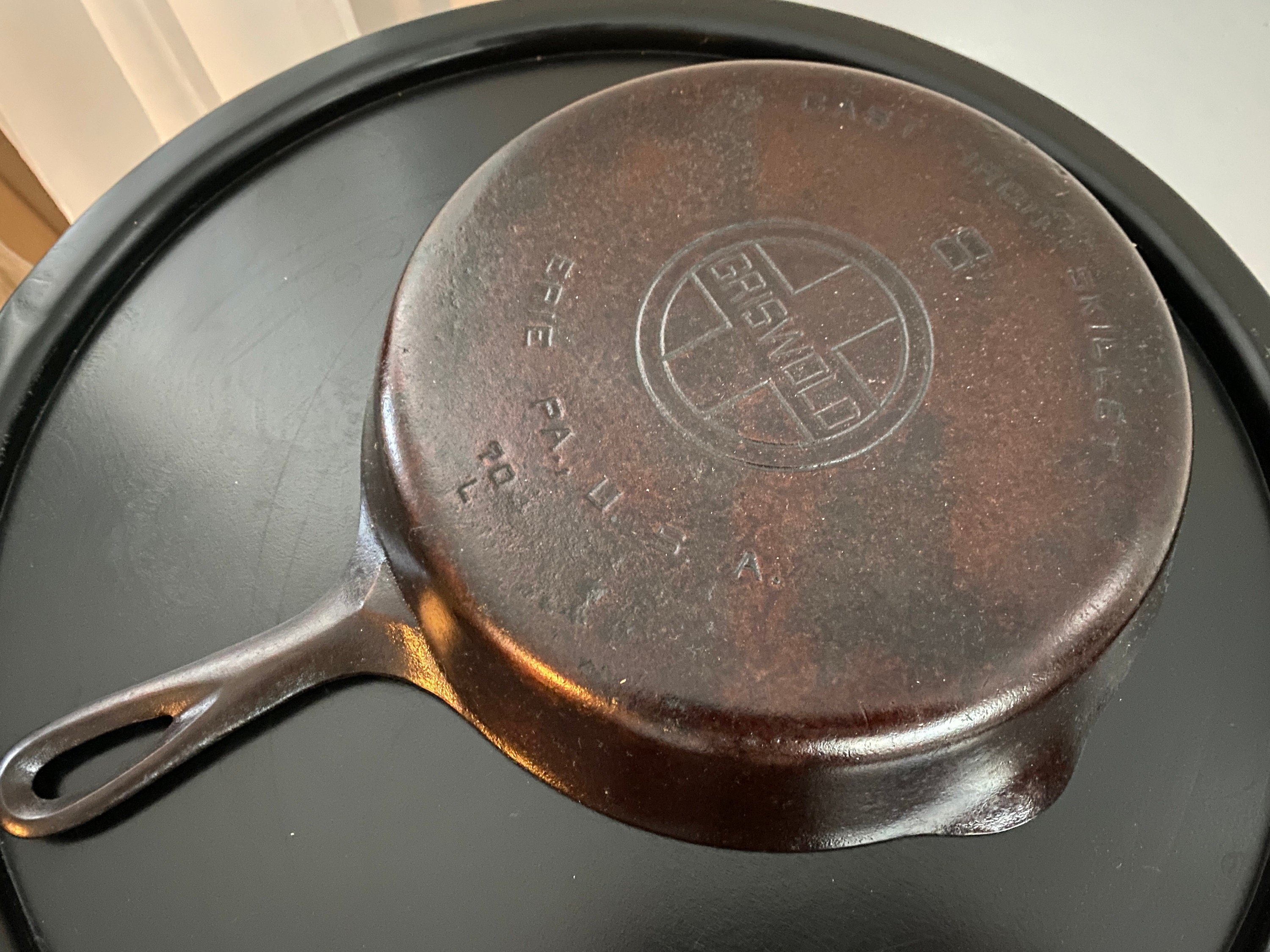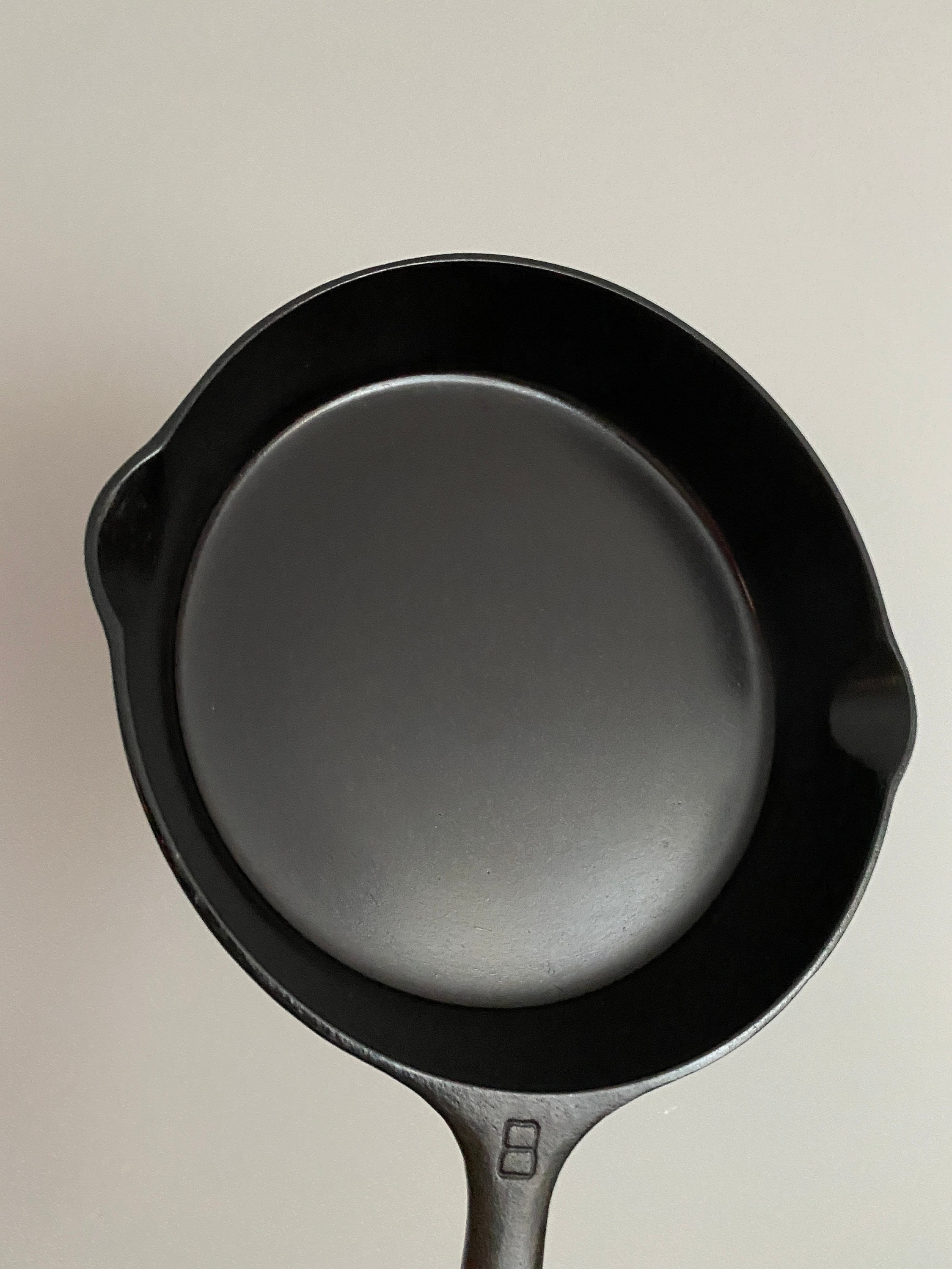 This Griswold no. 8 Skillet has been restored, seasoned and is now ready for the kitchen! As you can see in the photos, there is some pitting and fading (especially the 4 on 704.) The skillet also has a pretty decent wobble to it. I made a video of the wobble which you can find above. The discoloration from the seasoning will darken and even itself out with use. The cooking service is in fantastic condition.