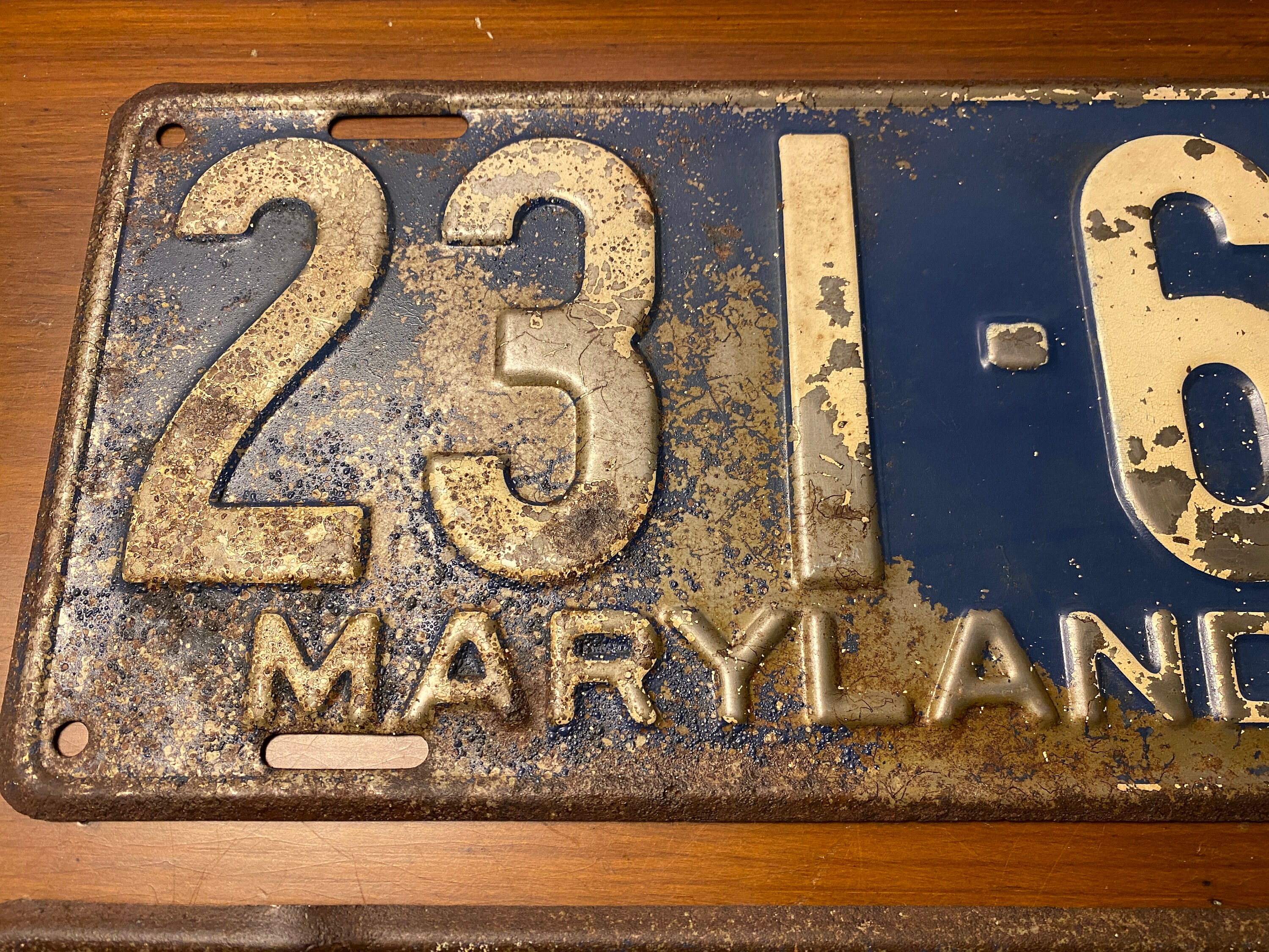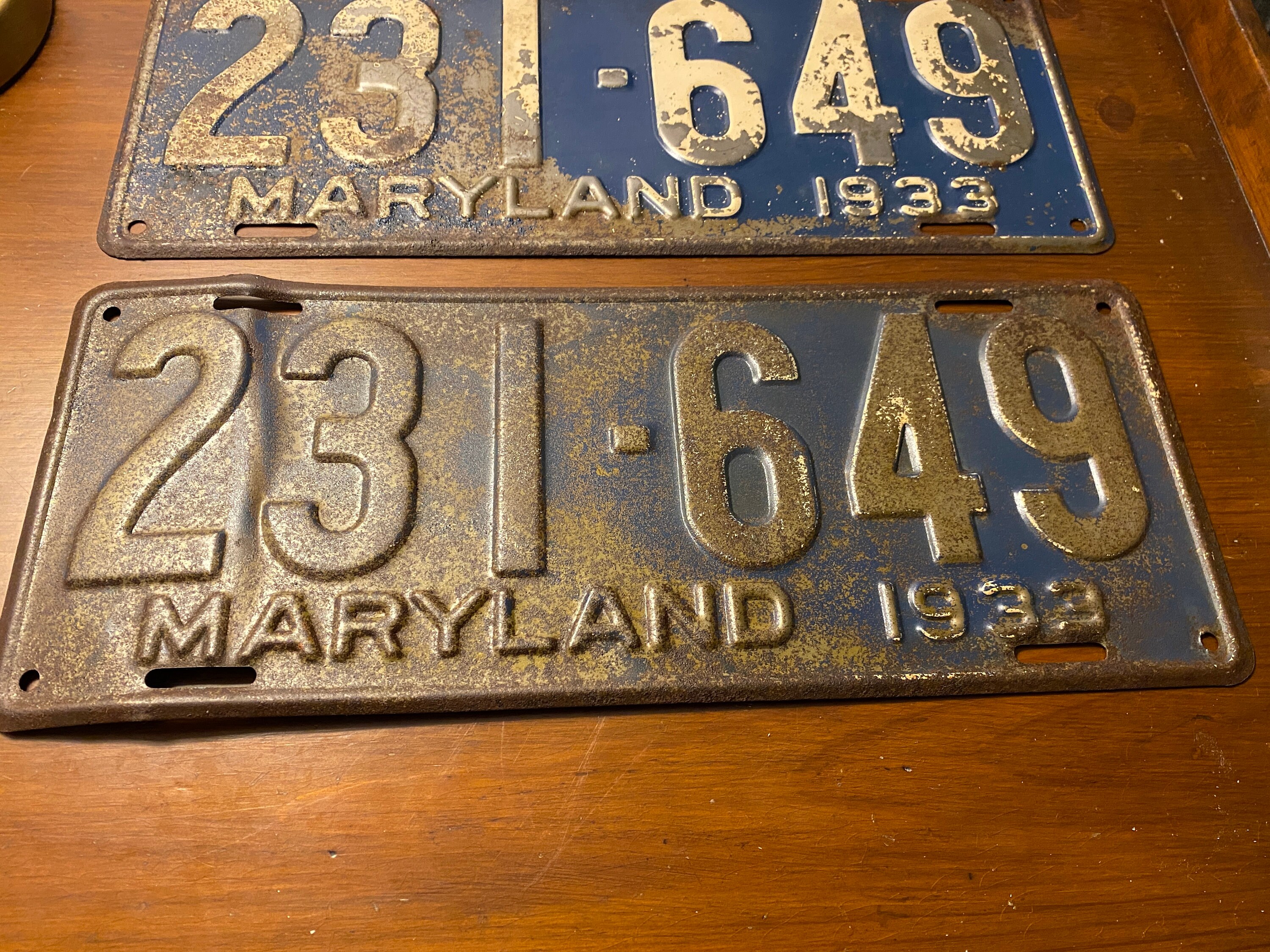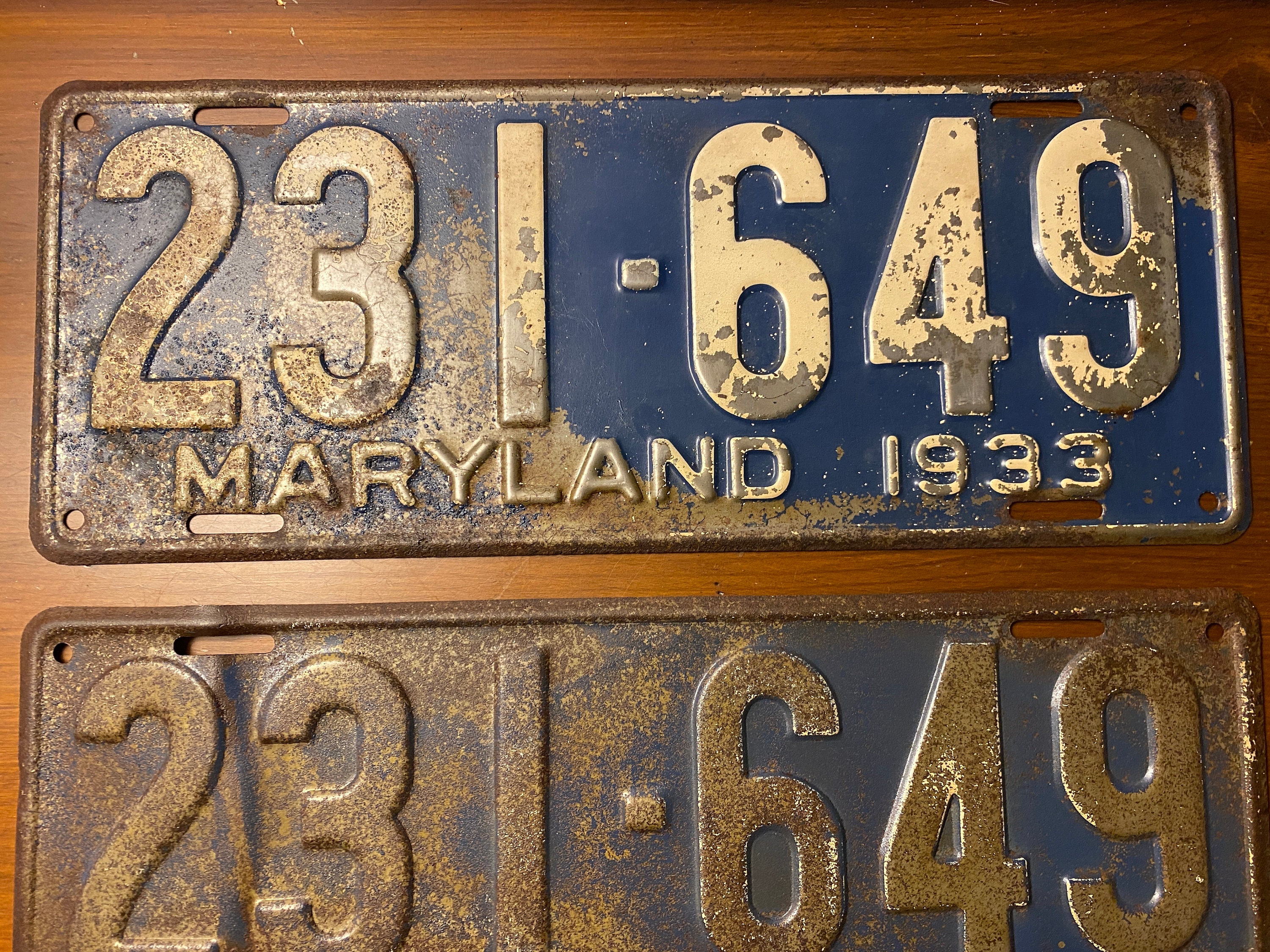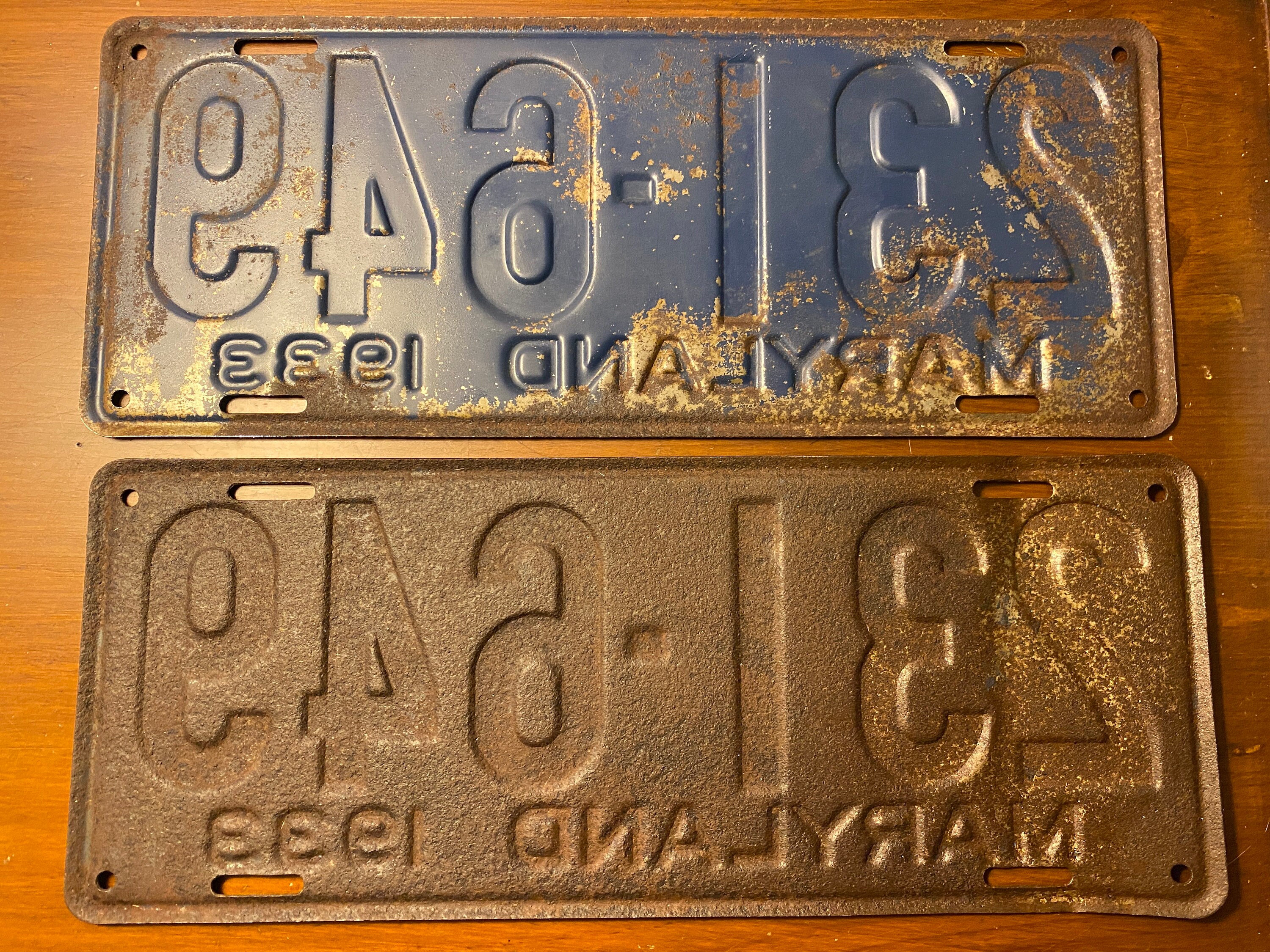 These plates have all the wear and tear you'd expect from license plates from the 1930s. A lot of the paint has worn off and they've been dinged up a good amount since 1933. Yep, there's no hiding how old these plates are. Very cool to find them still together though after all these years.