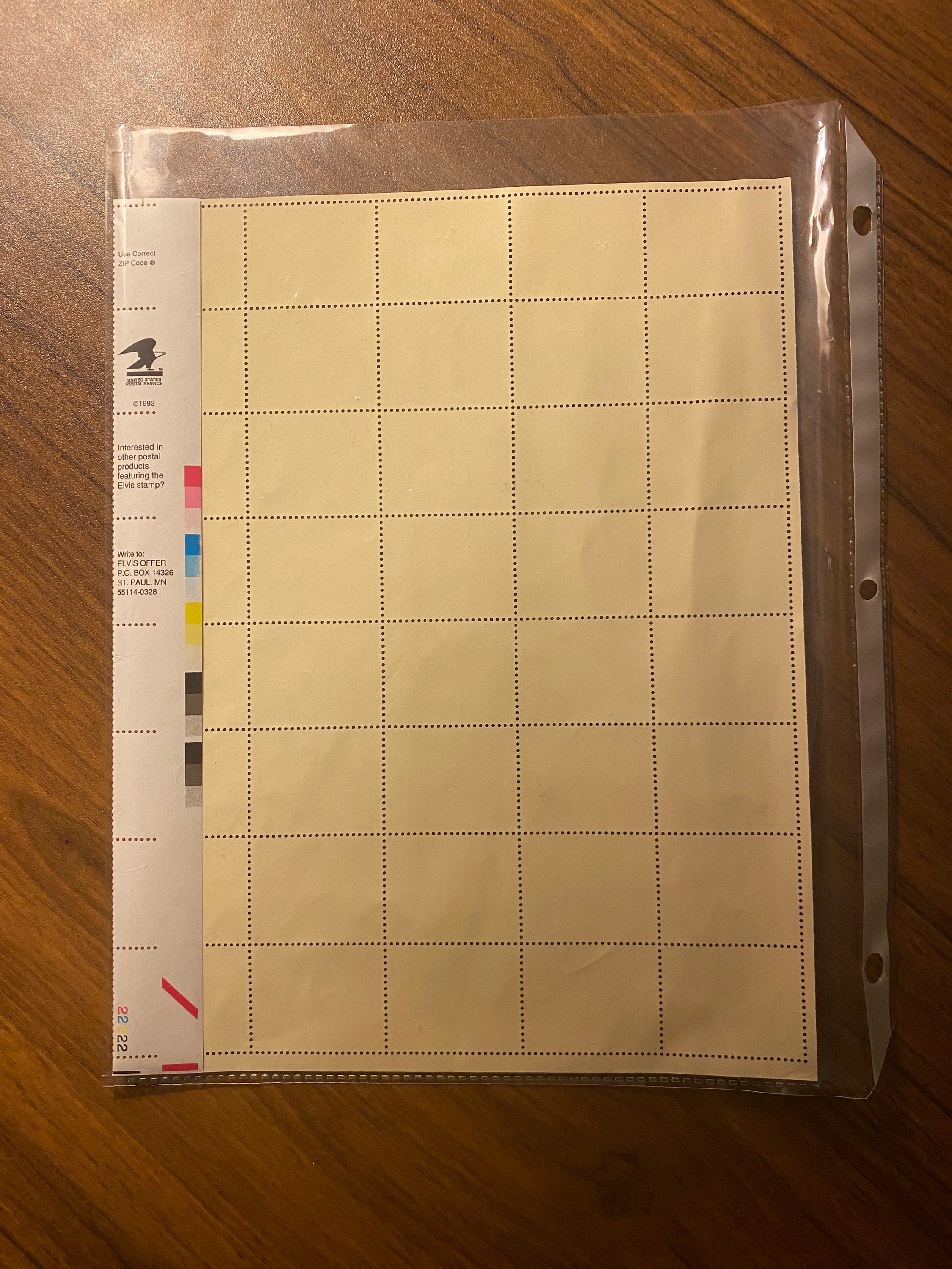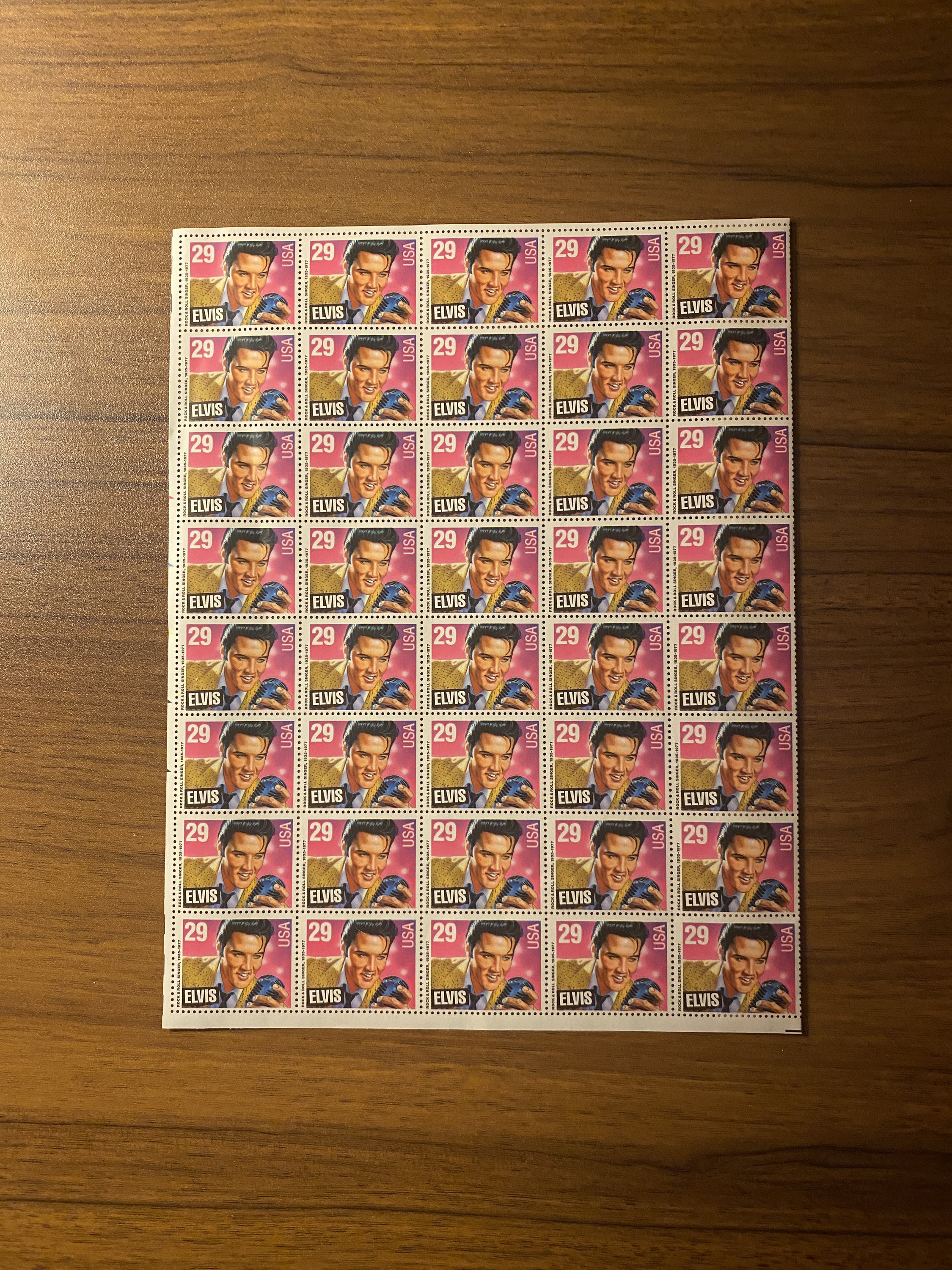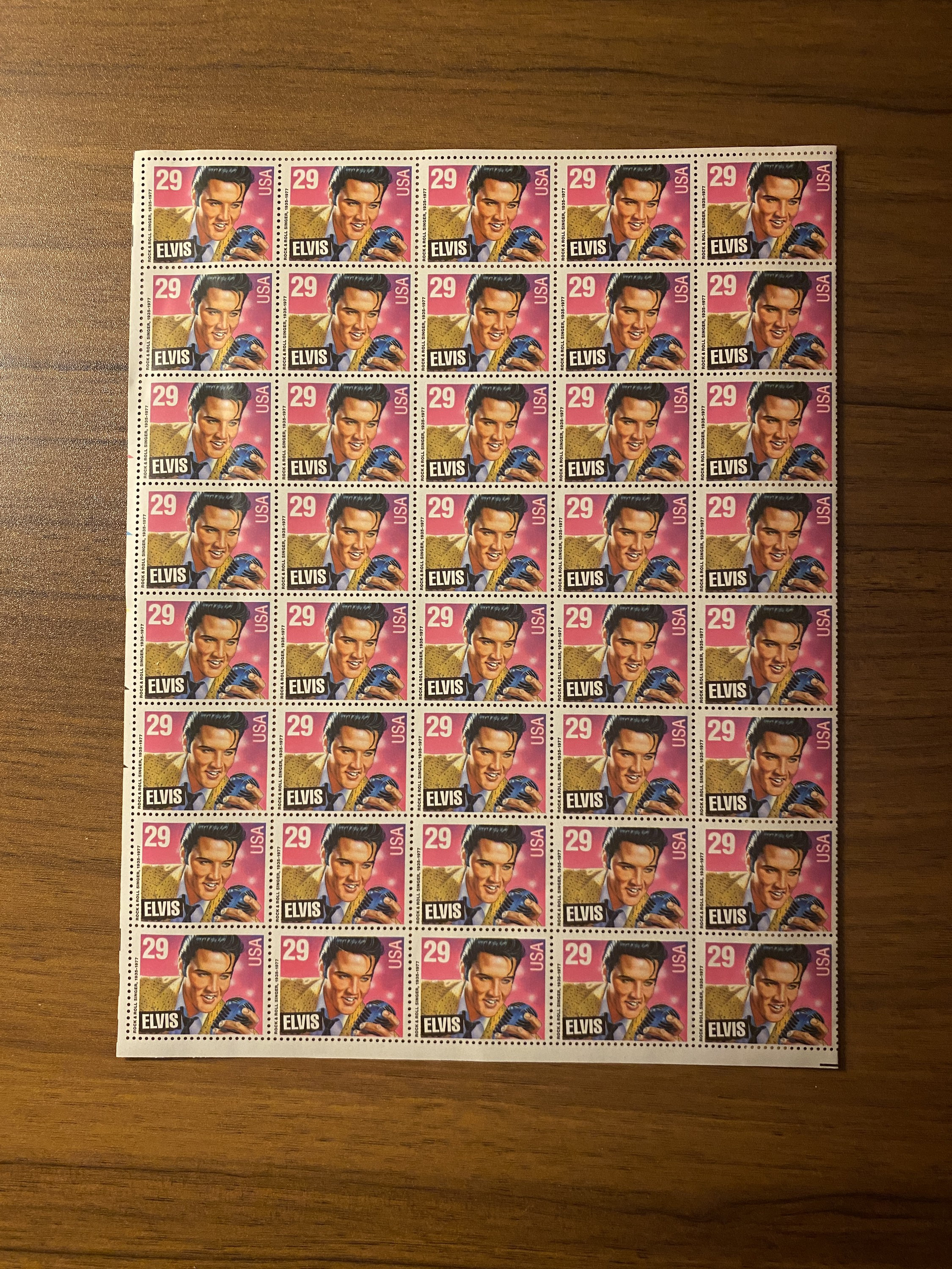 Purchased some old binders at an estate sale and found this inside one of them. A whole sheet of vintage 29 cent Elvis Presley stamps!