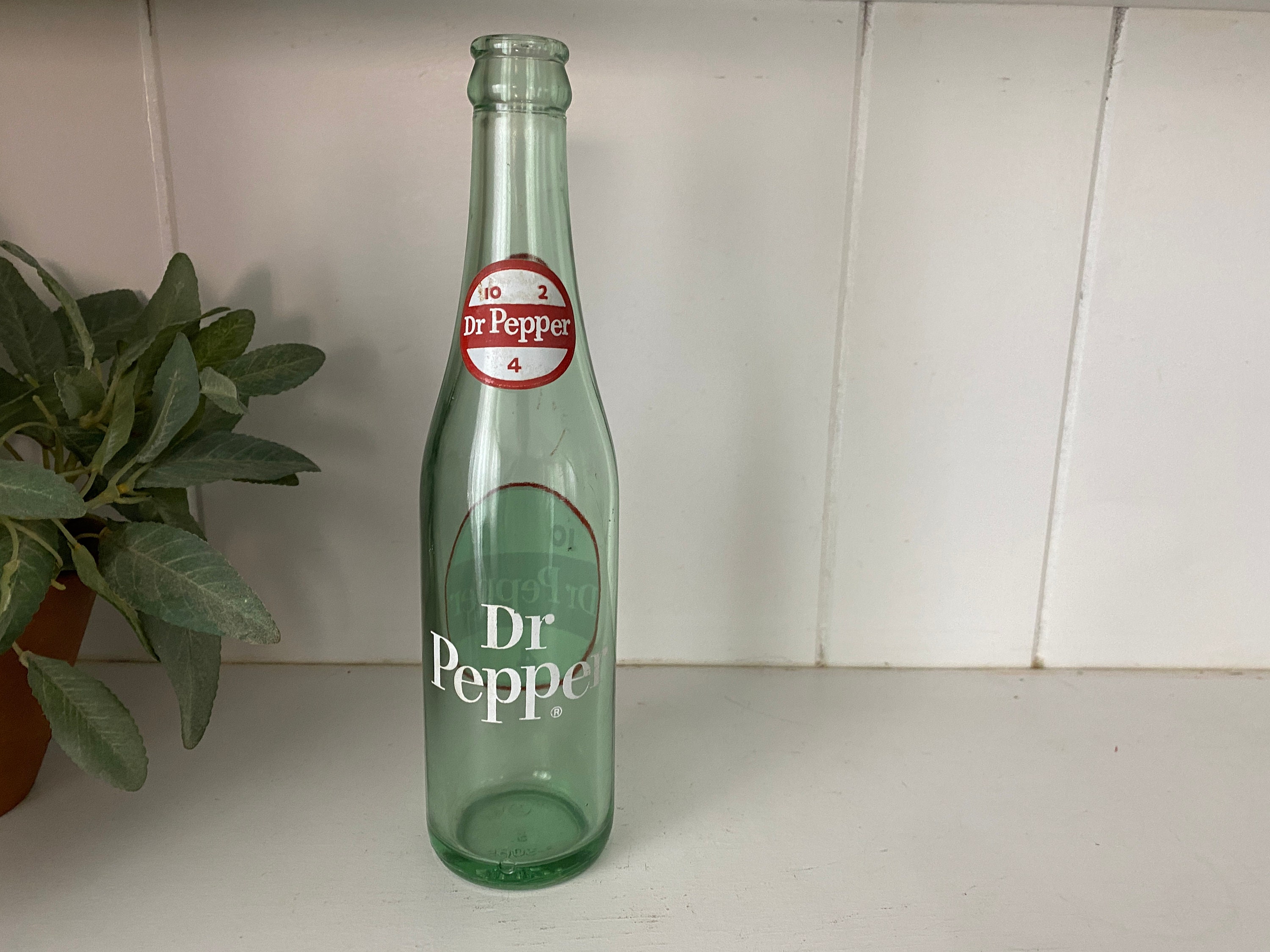 Beautiful vintage Dr. Pepper glass bottle from the 1960s in incredible shape for its age.
