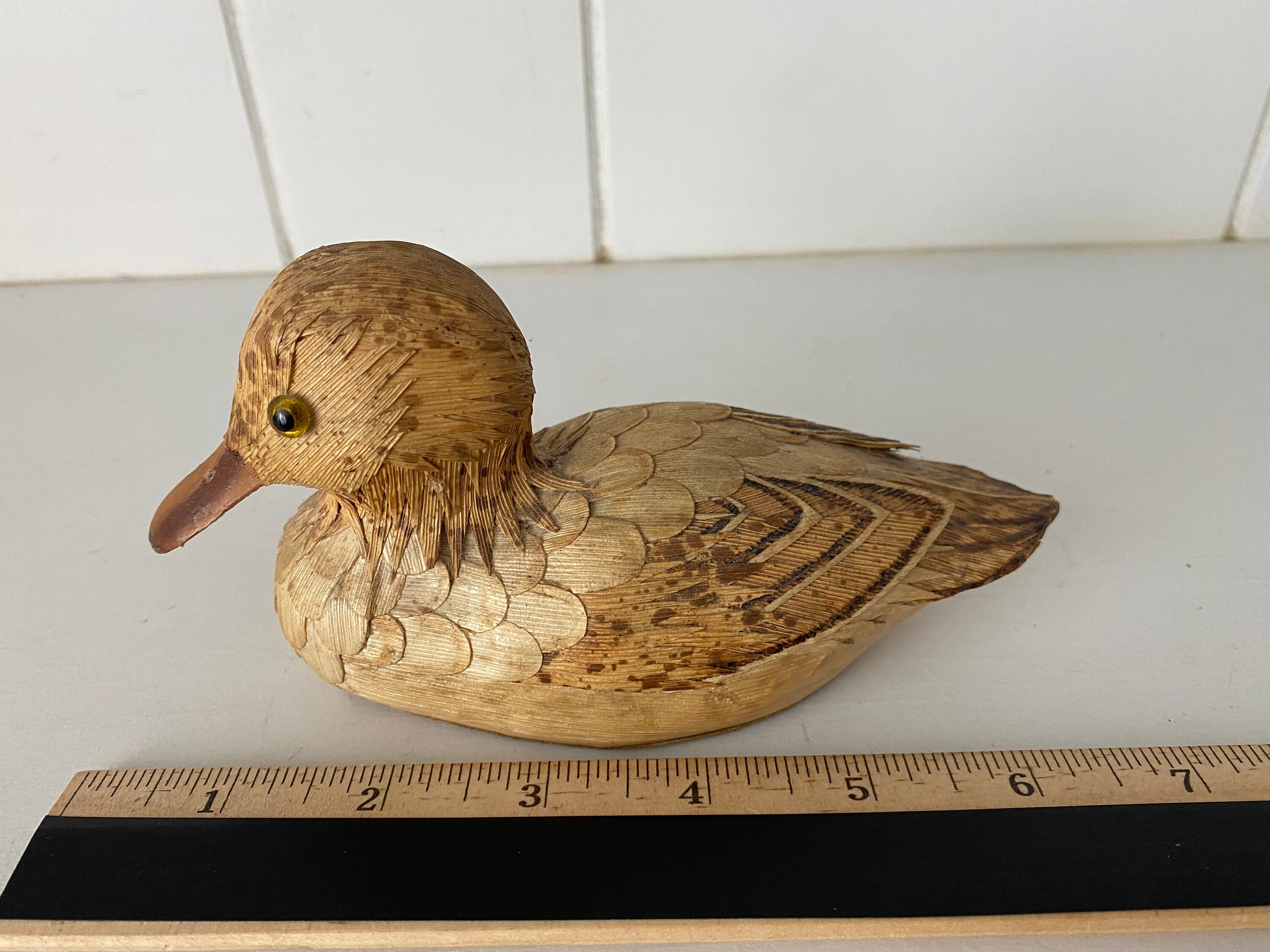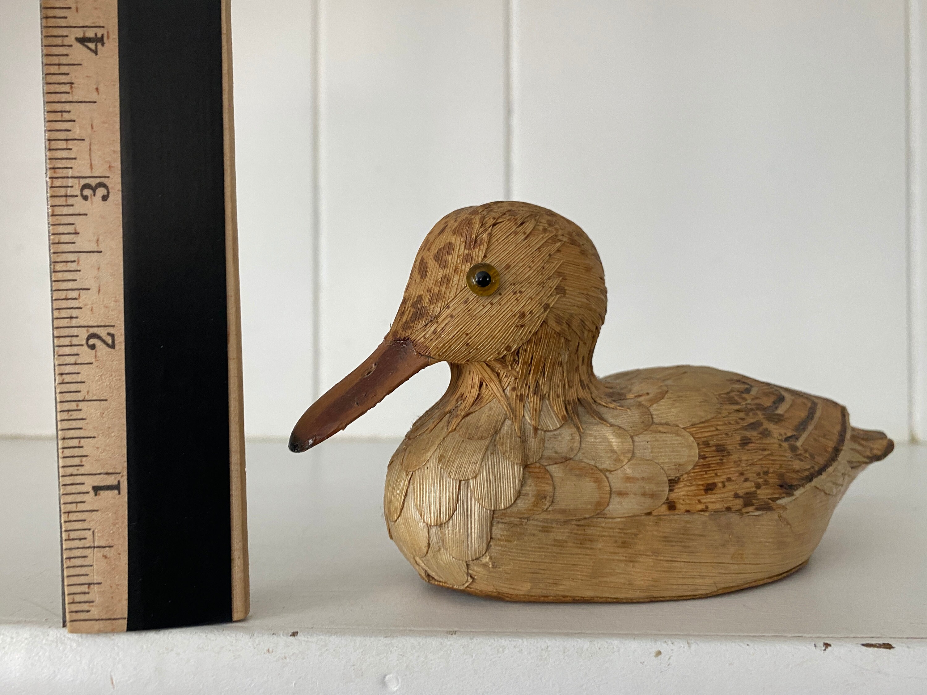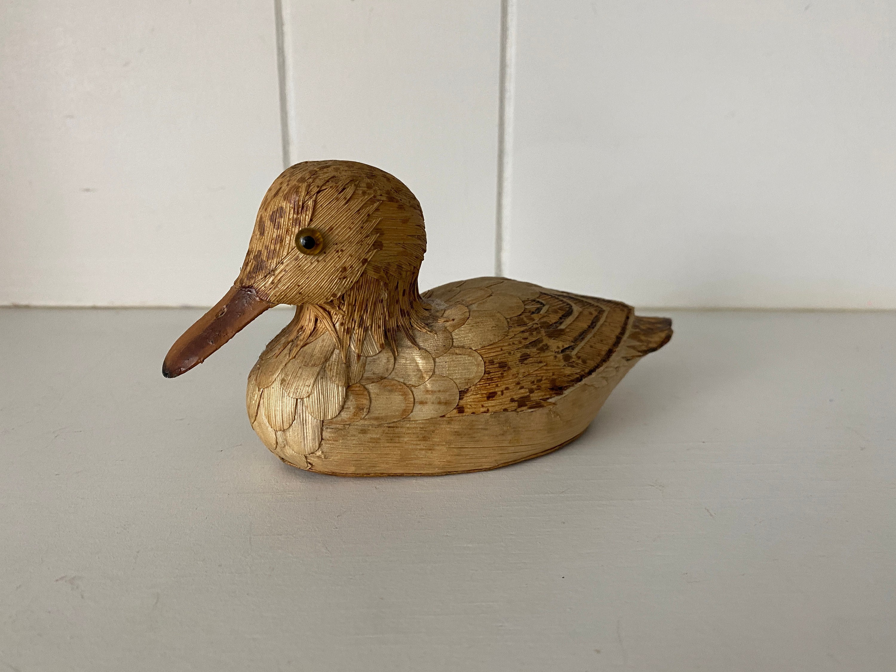 Vintage hand-made duck (age unknown.) A very high level of detail. I am not entirely sure what this duck is made out of. It looks like strands of fiber. The sticker on the bottom reads "Fabrique en Chine. Made in China."