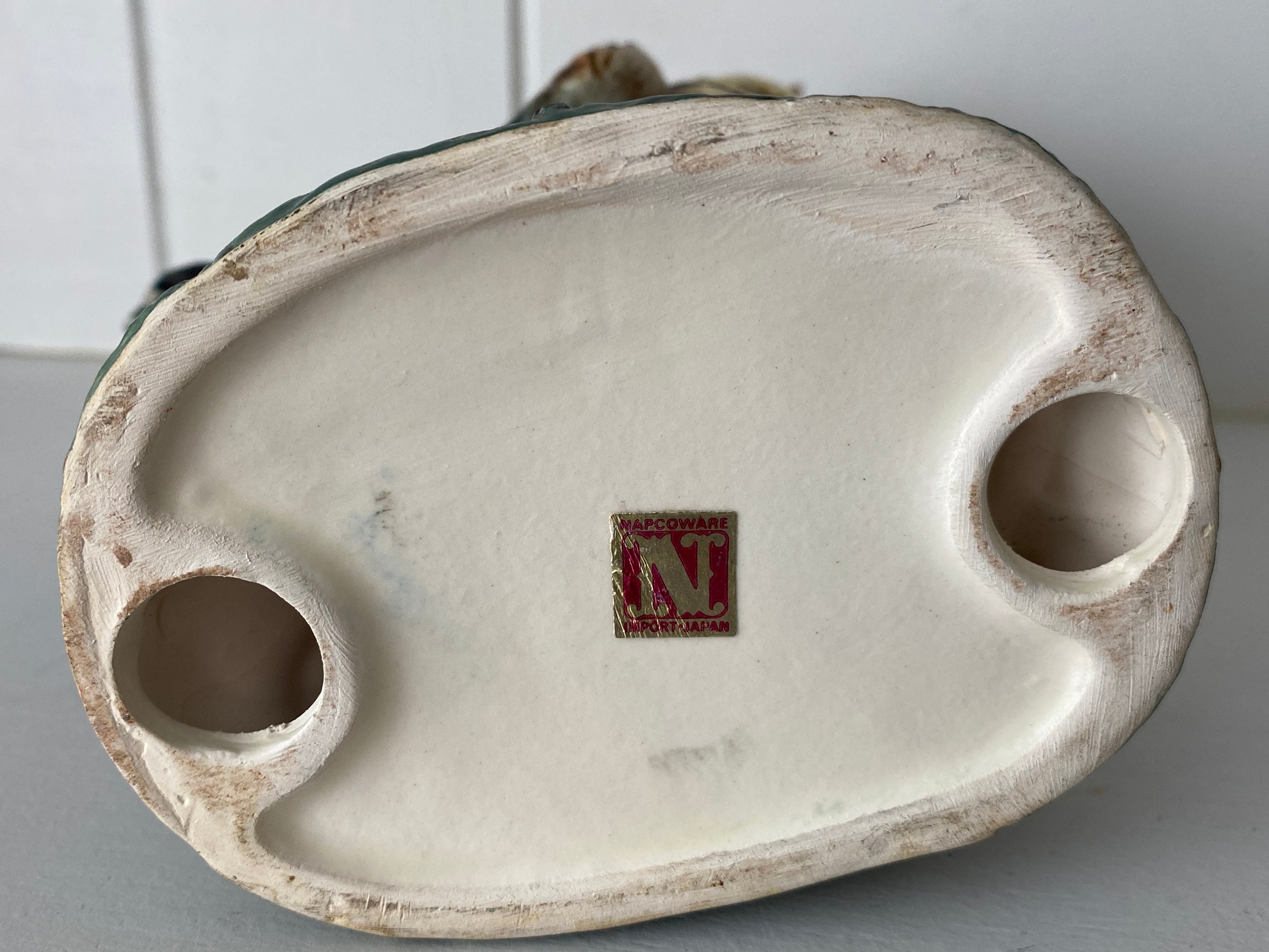 Napco used multiple manufacturer marks for their head-vases and figurines with some being transfer marks and others being paper labels. The following could be found on their paper labels: "A Napco Collection," "Napco Originals by Giftware," "National Potteries Co., Cleveland, OH, Made in Japan," and "Napcoware, Import Japan." The “Napcoware” figurines, which are seen as being lesser in quality by some collectors, but this is not a universal consensus. - francinesfigurines.com