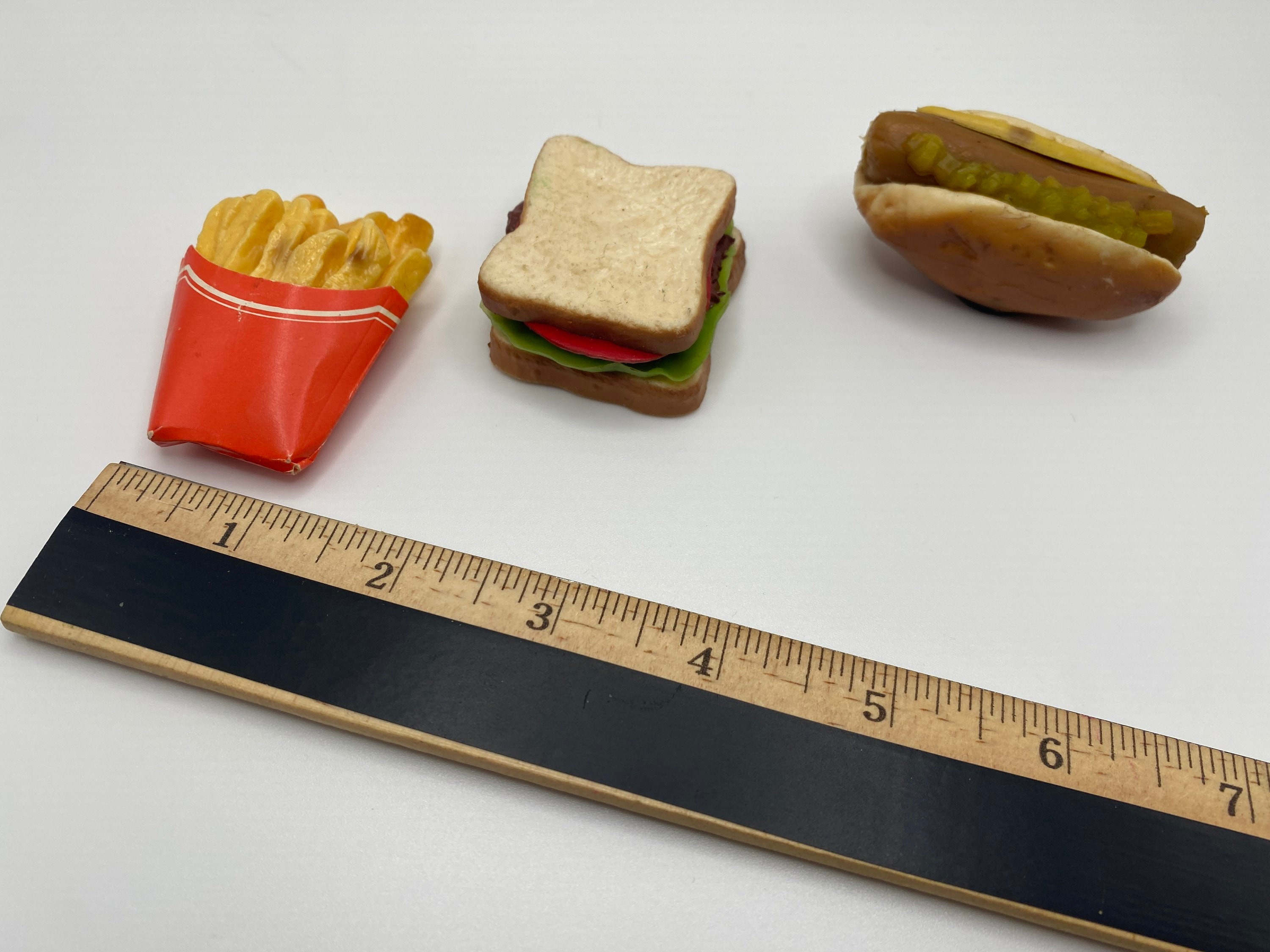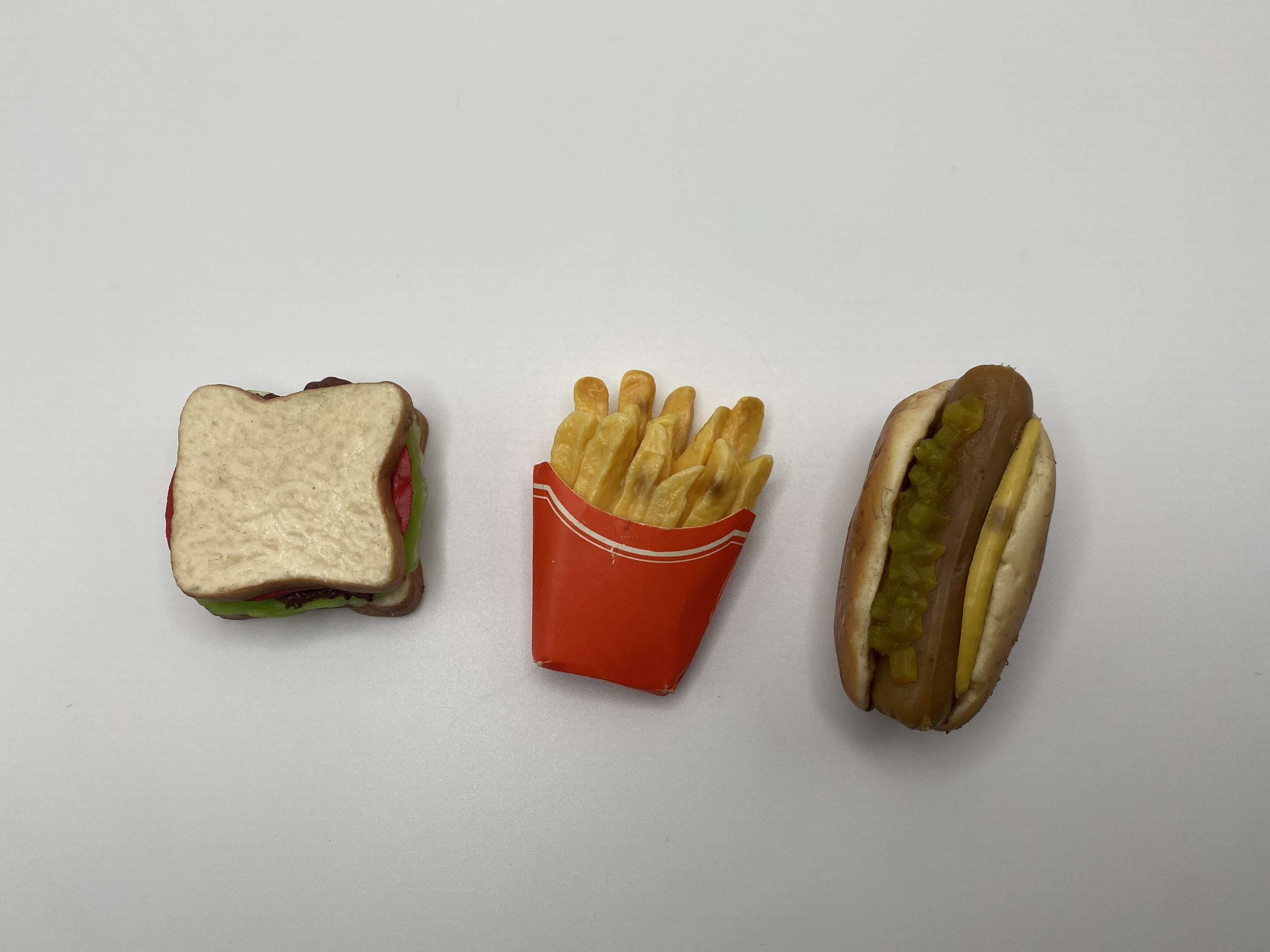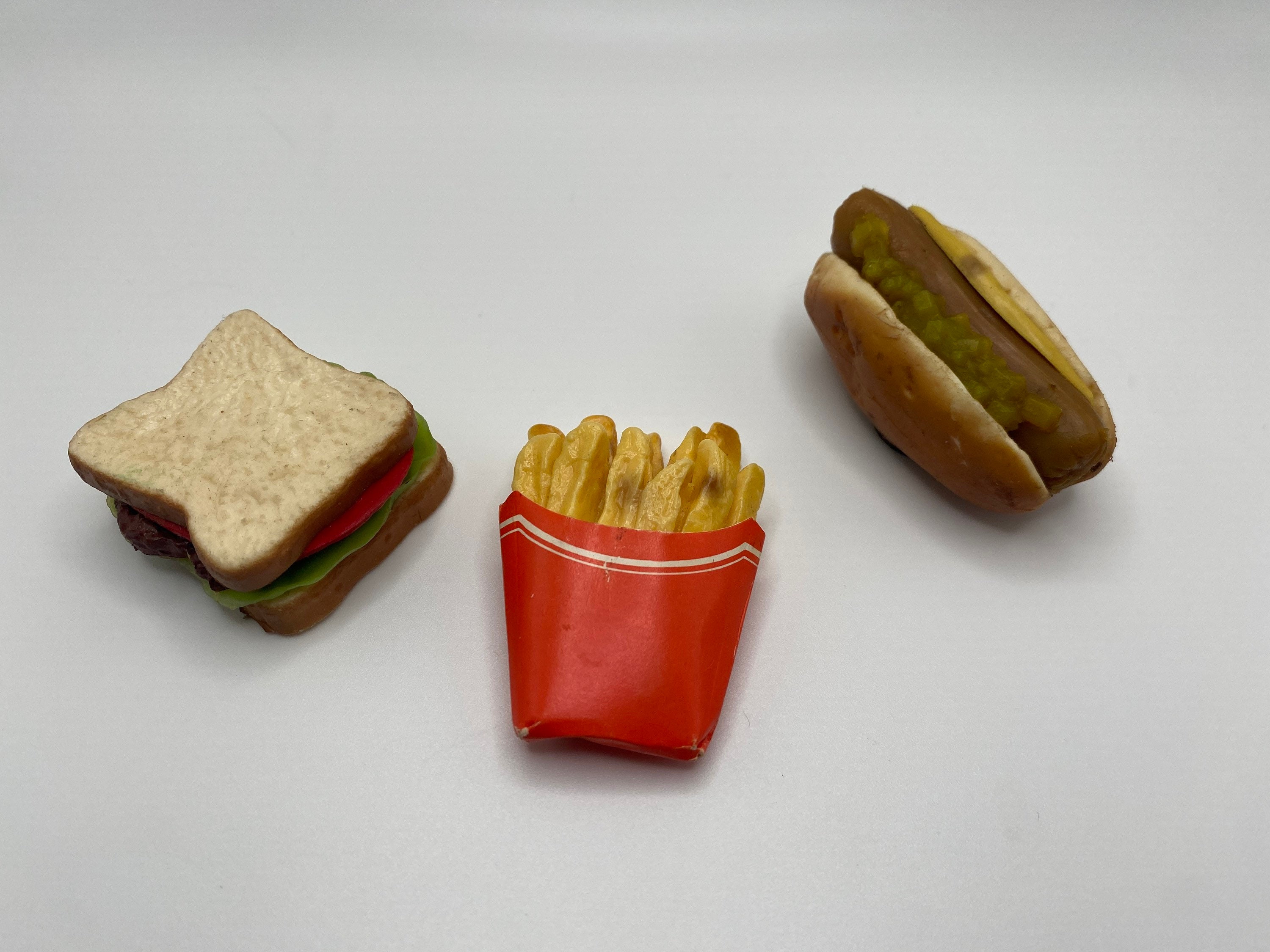 Set of three vintage rubber refrigerator magnets. Hotdog, French Fries and Sandwich.