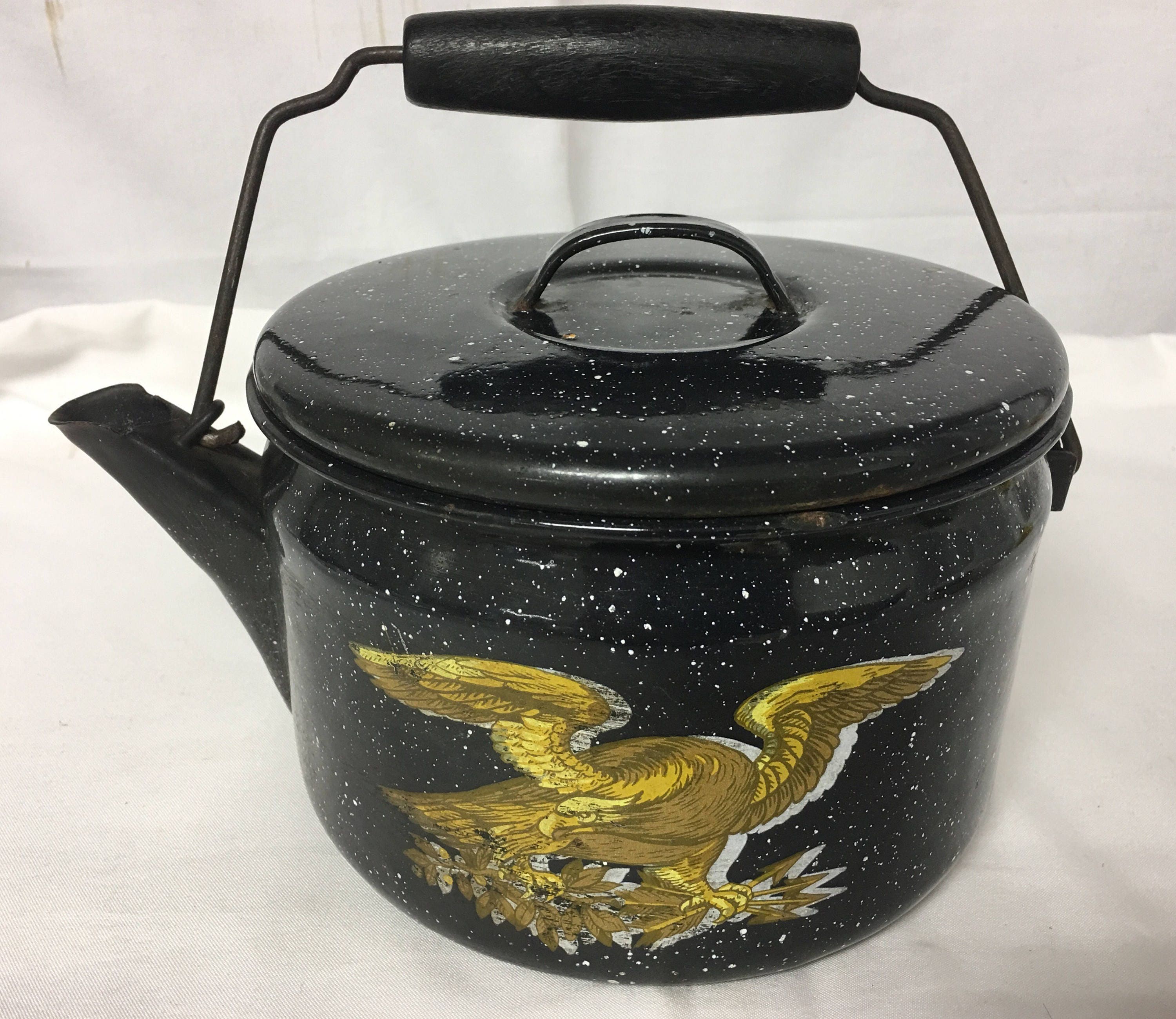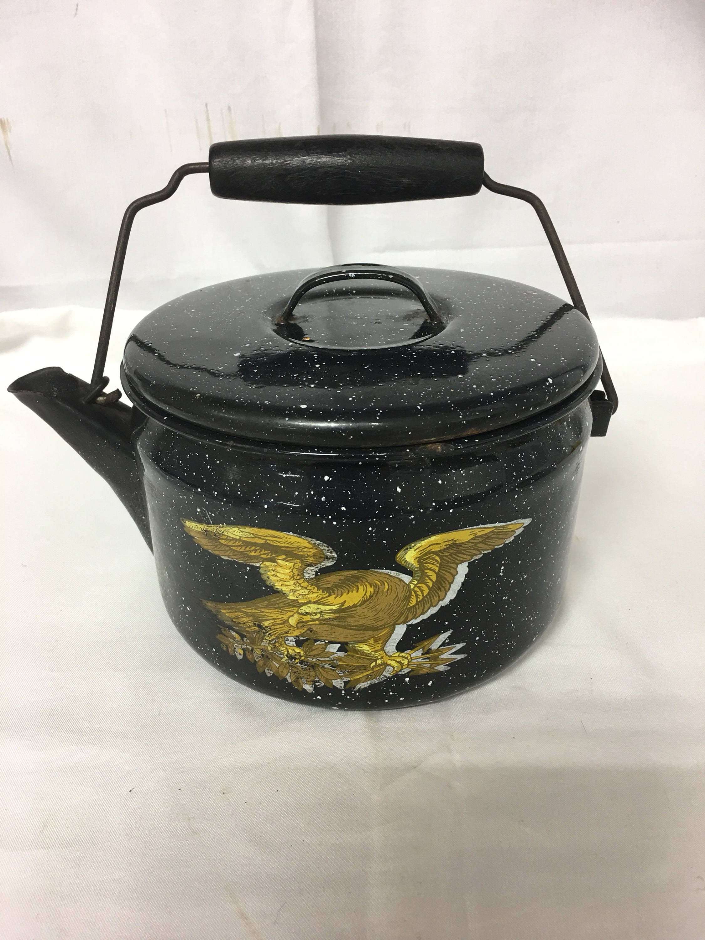 Vintage Granite Ware Tea Kettle with American Eagle Decal. Nice kettle with just a few condition issues. Interior is discolored from use but clean; very minor rust pitting on lid and kettle lip. All-in-all, a good find.