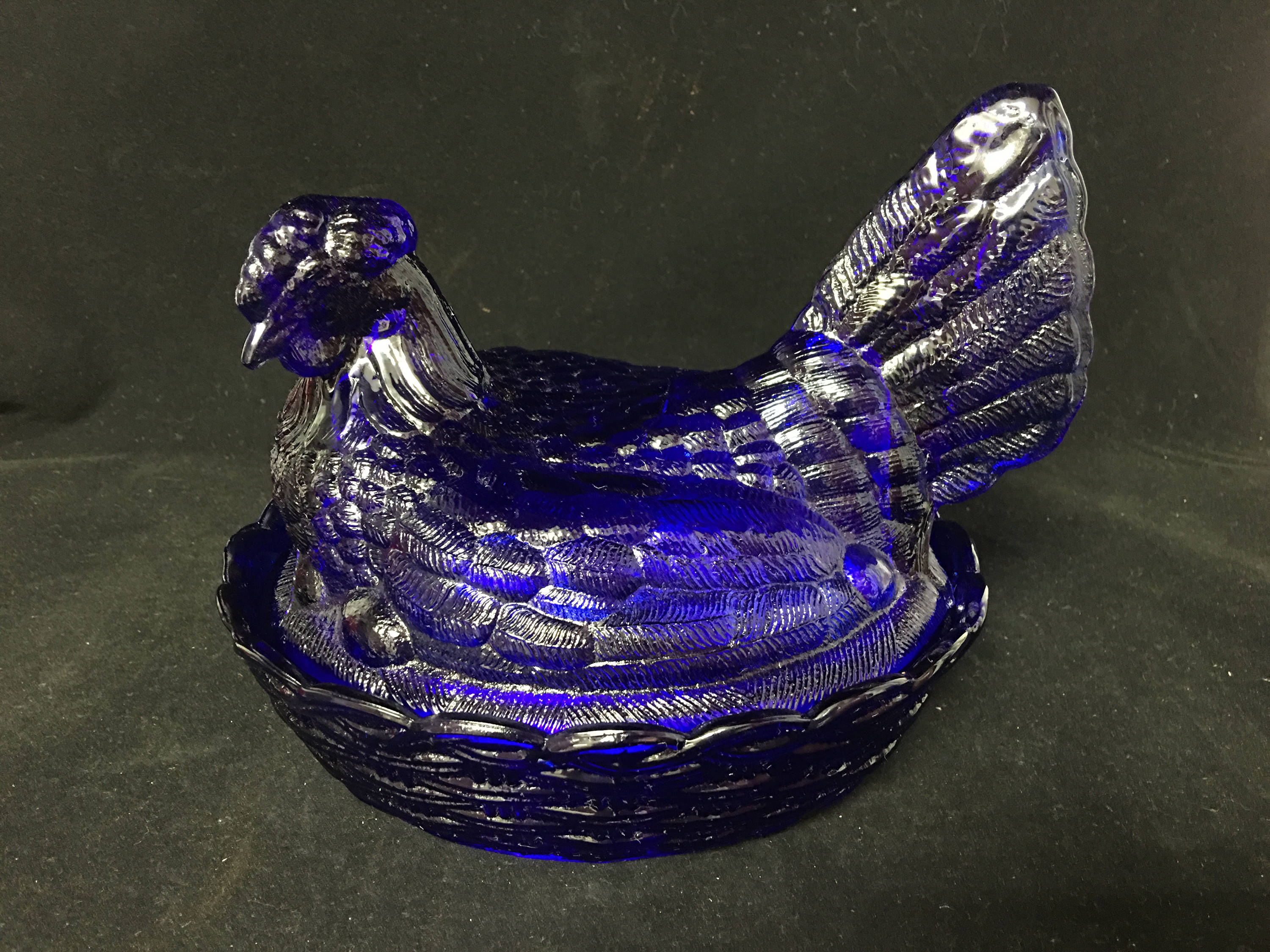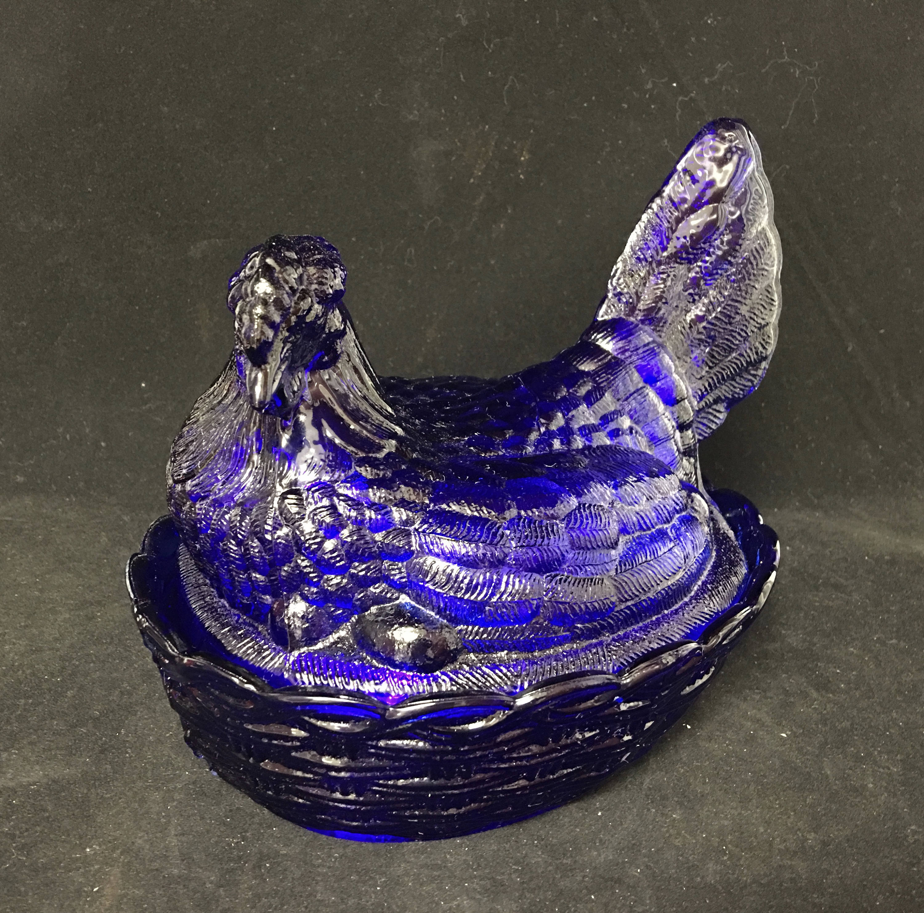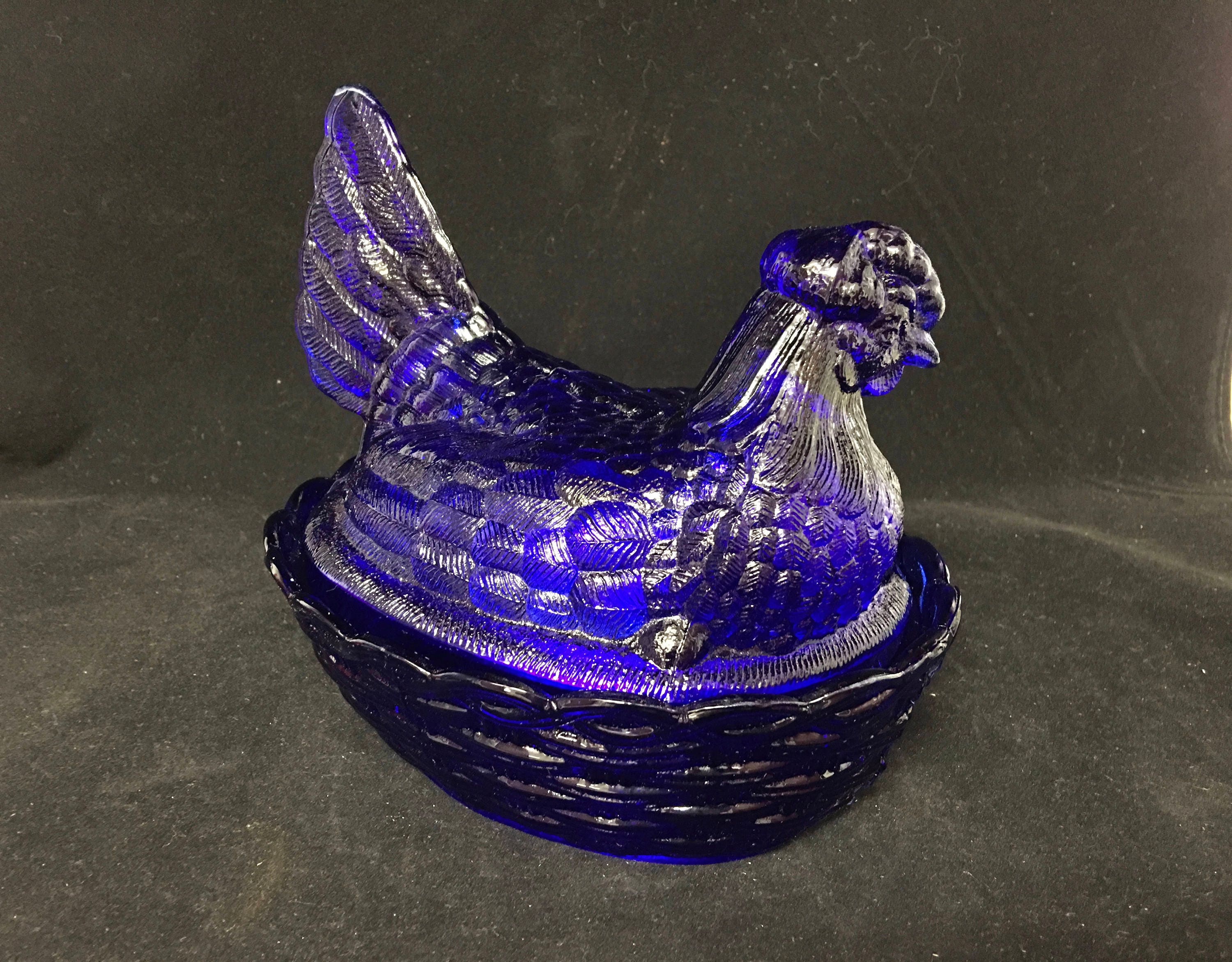 Very nice LARGE Cobalt Blue Nesting Hen (Wt. 3lbs). Standing at 7.5"H, this hen is perfect as a candy dish, cookie jar, napkin holder--or simply as a shelf sitter, home decor accent piece. It's fanned tail serves as a easy grip for lifting the lid.