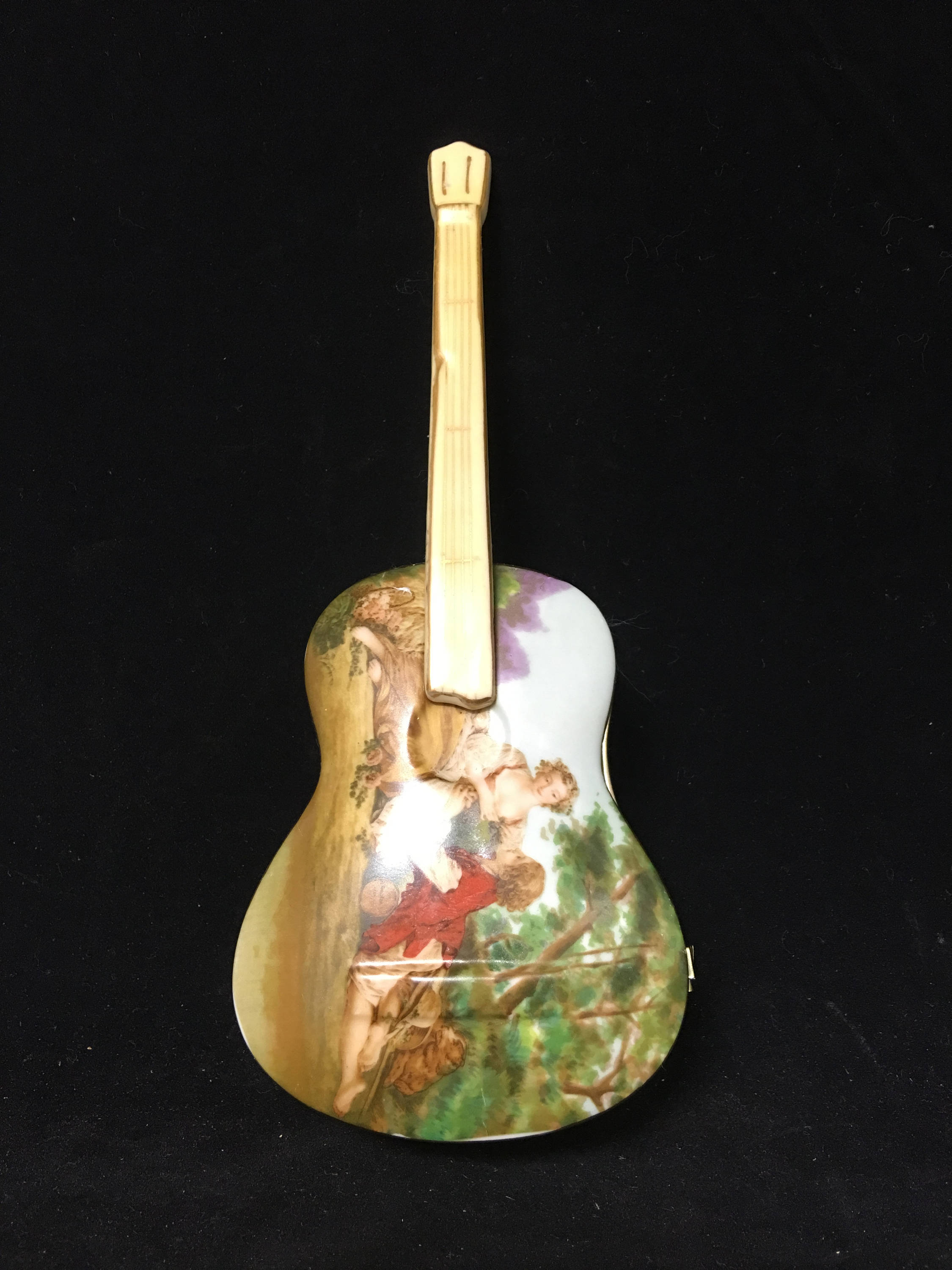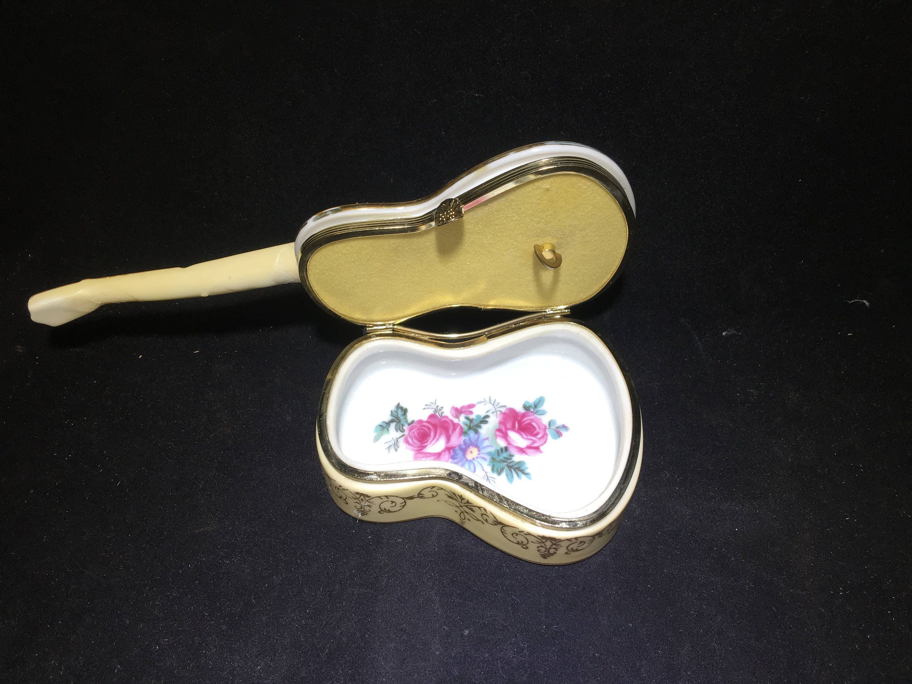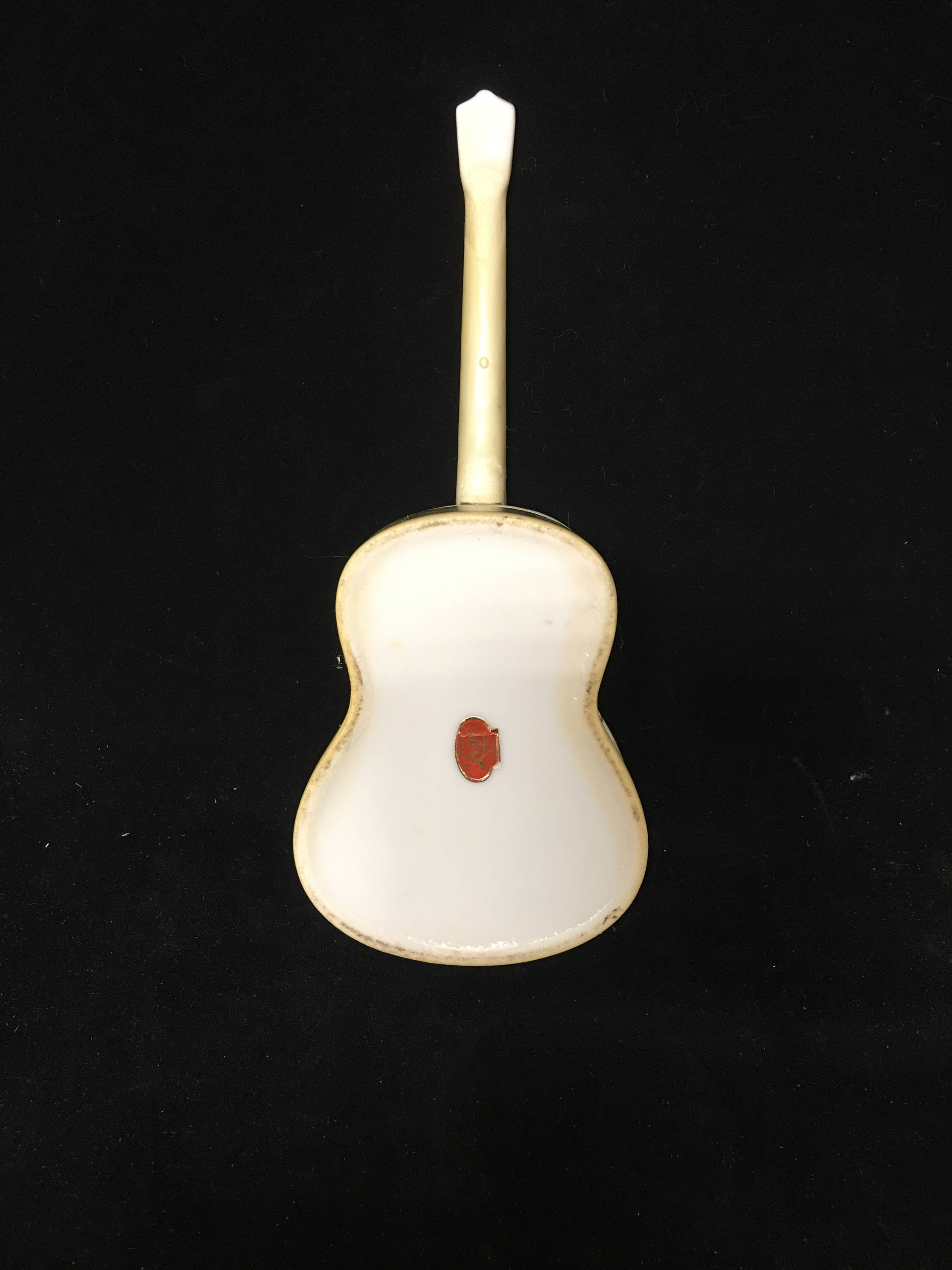 Vintage (1950) Lego Guitar Music Box plays "Anniversary Waltz." This lovely guitar shaped music box is perfect for that special piece of jewelry or trinket or display on a ladies vanity. Made of porcelain with painted exterior and interior graphics, the music box has minor age appropriate wear and has no cracks or chips; the music component works well.