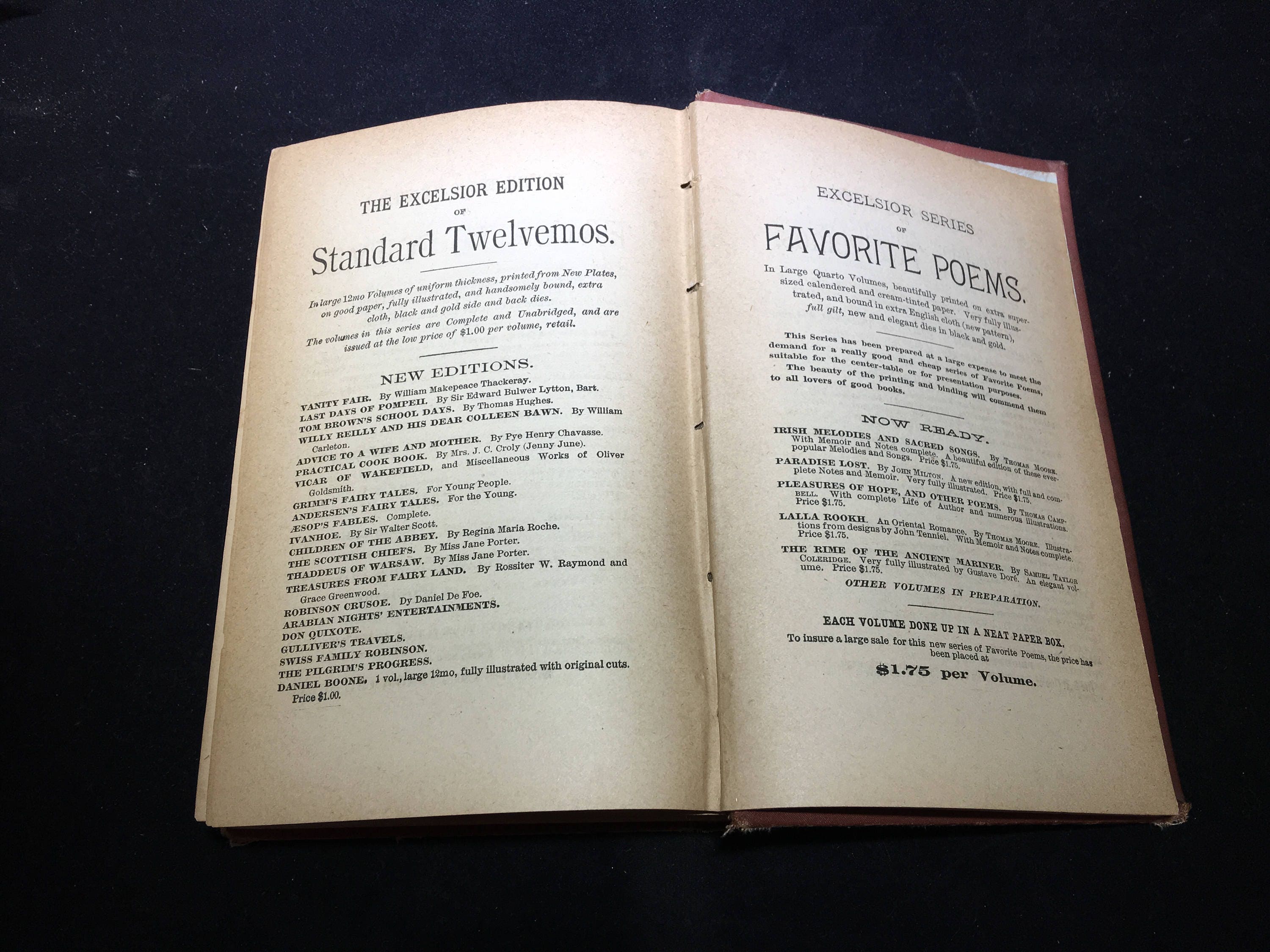 Vanity Fair "Novel Without A Hero" by William Makepeace Thackeray published by the Excelsior Publishing Company, New York (no copyright date). Original owner reference date is November 28th 1890. Binder has condition issues but is fully intact; all pages are present. See photos for other condition issues.