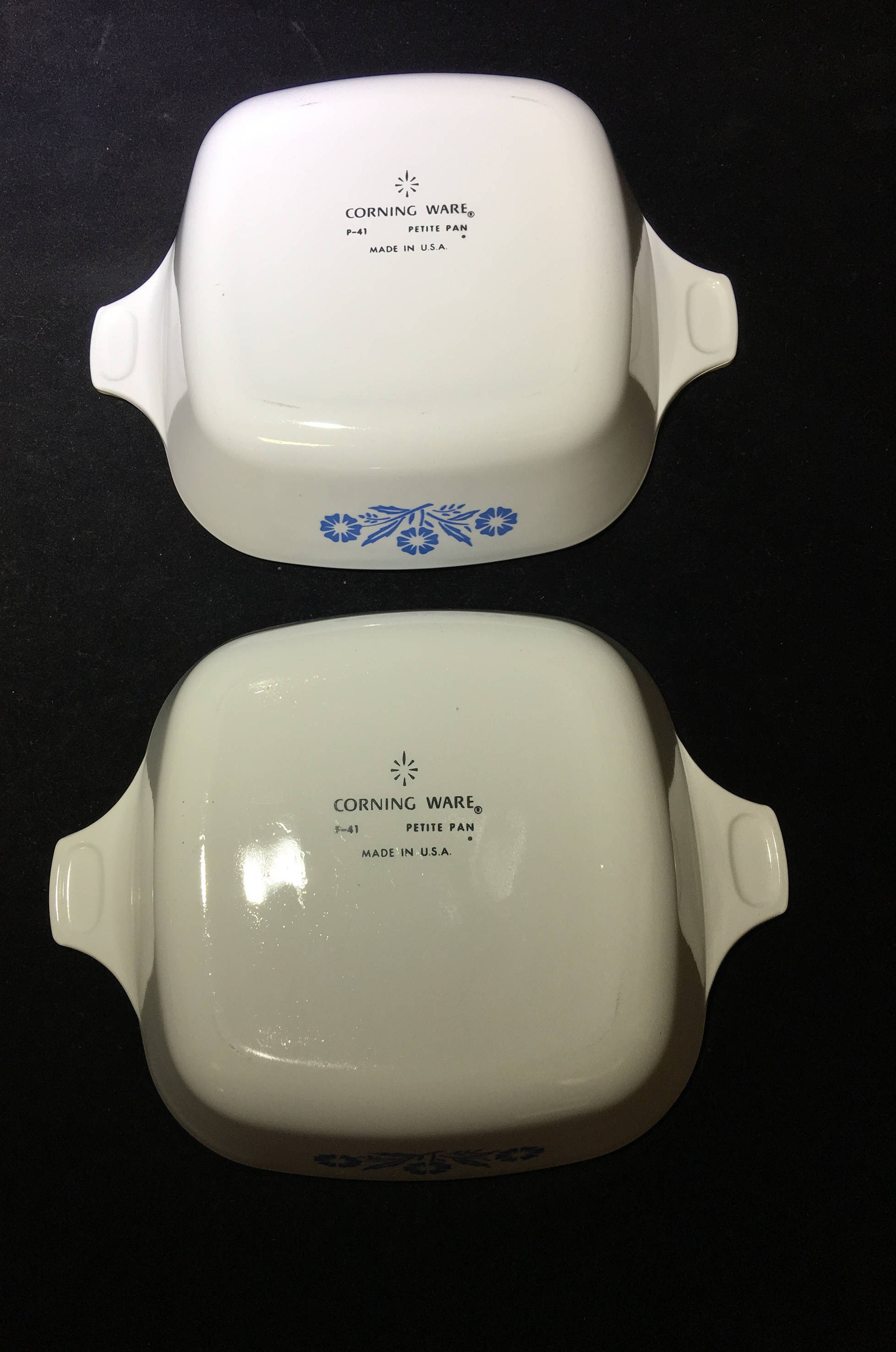 Nice 3-piece set of Corning Ware Cornflower Blue Petite Dishes - 2 uncovered "Petite Pans" and 1 covered "Mini Casserole" dish. Lovely on their own or as an additional to a Corning Ware collection. No chips or cracks.
