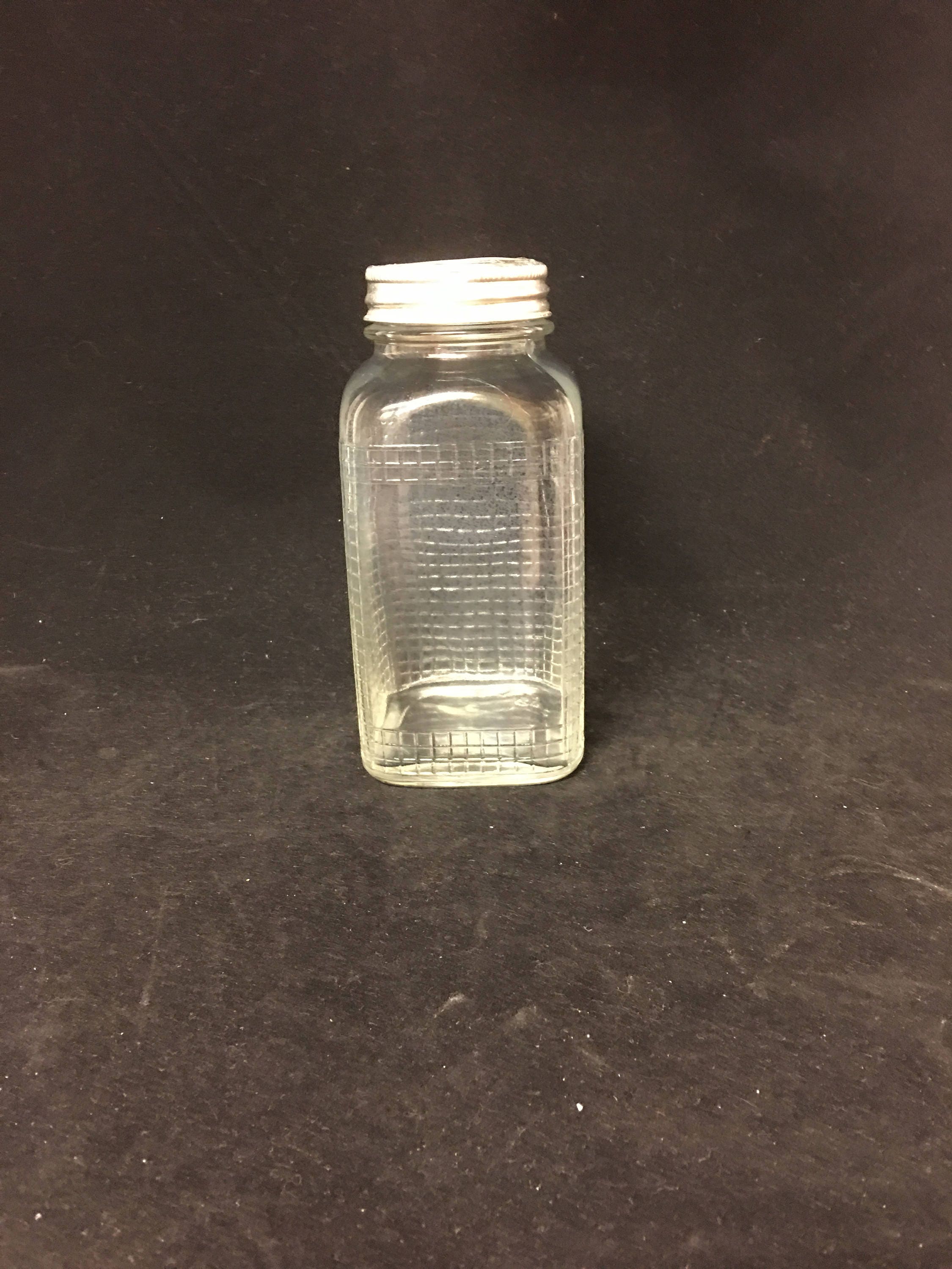 Good condition Canning Jar features Atlas glass lid and Good Housekeeping stamped aluminum twist top. Three-sides are small check embossed, the fourth side is flat framed for contents label. Free of chips and cracks.