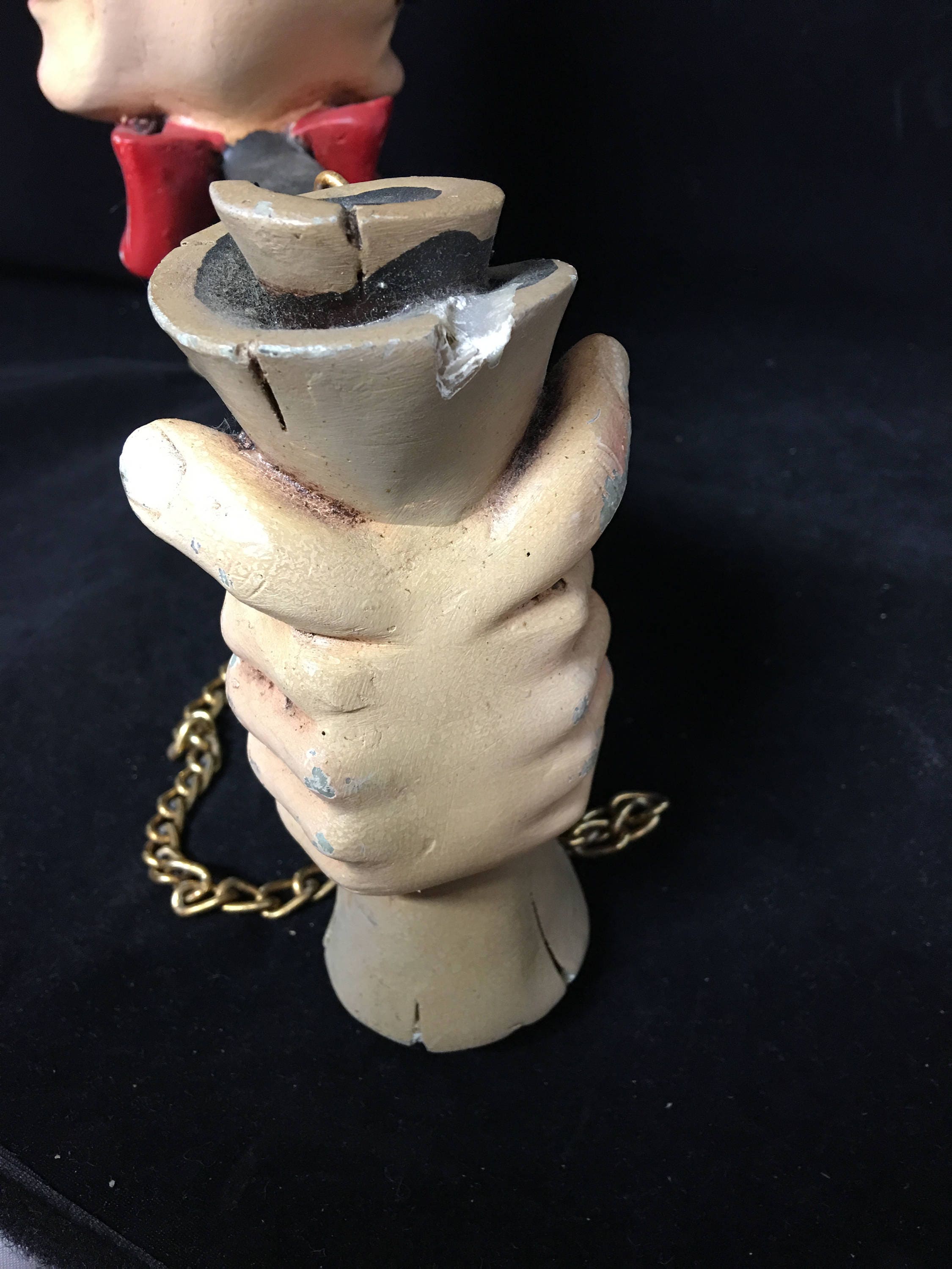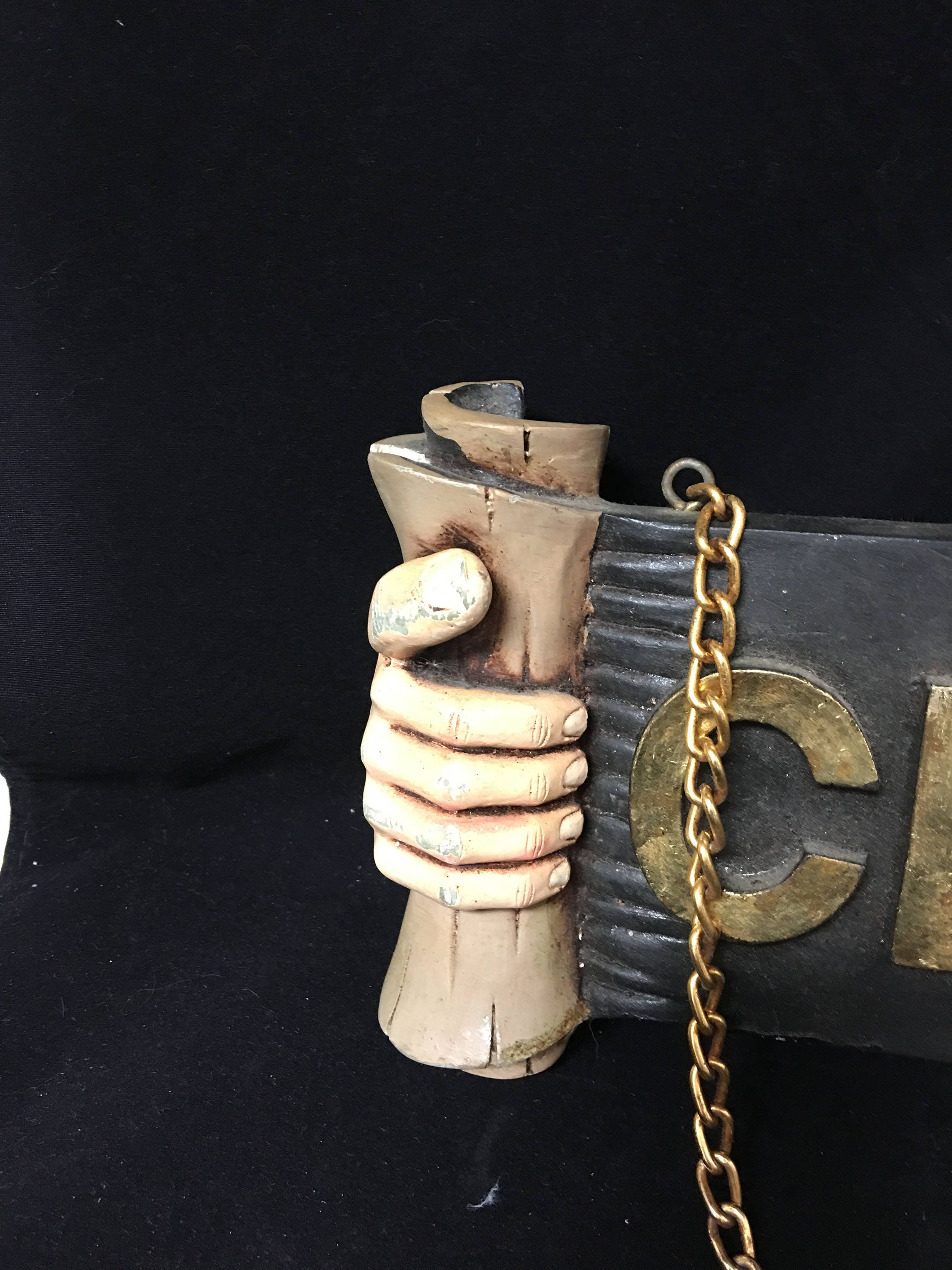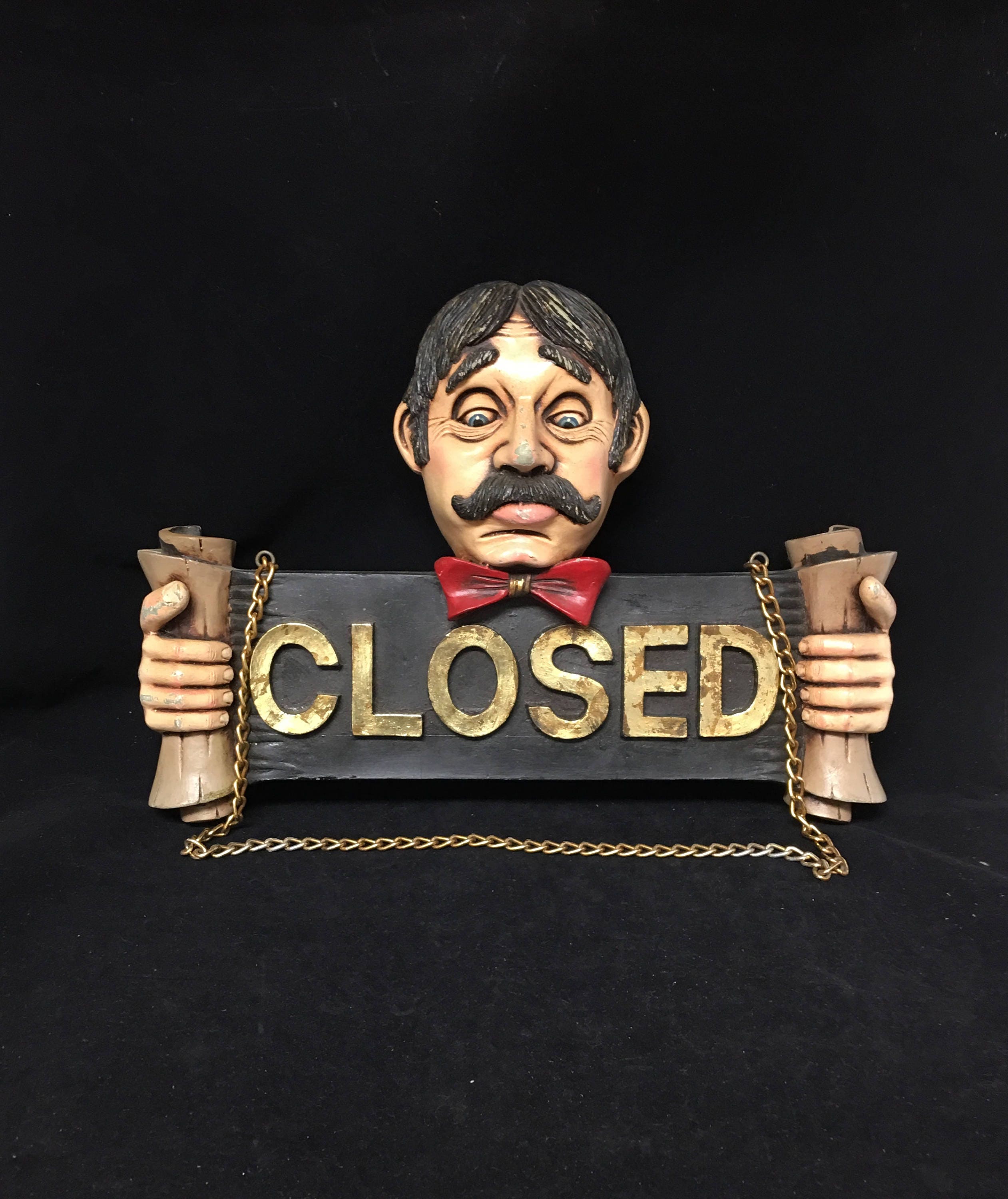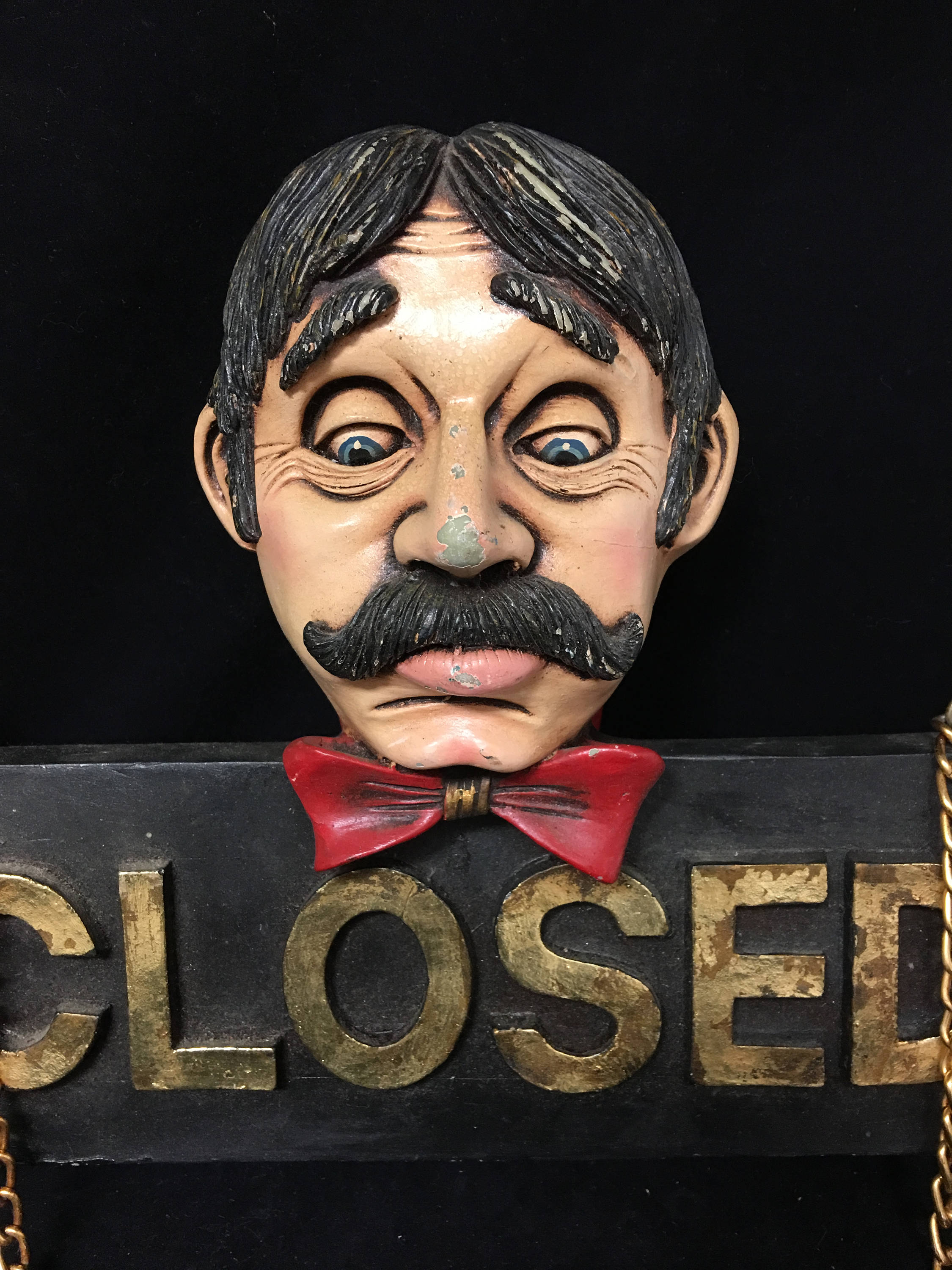 Whimsical vintage reversible Barkeeper's Open / Closed Hanging Sign. Made of sturdy resin material, this sign is perfect for the casual family/bar areas or man cave. A smile for Open and a frown for Closed. With its near perfect worn paint patina from age, this cool sign is enhanced by its being knocked around a bit (see photos). 3.5 lb hanging weight.