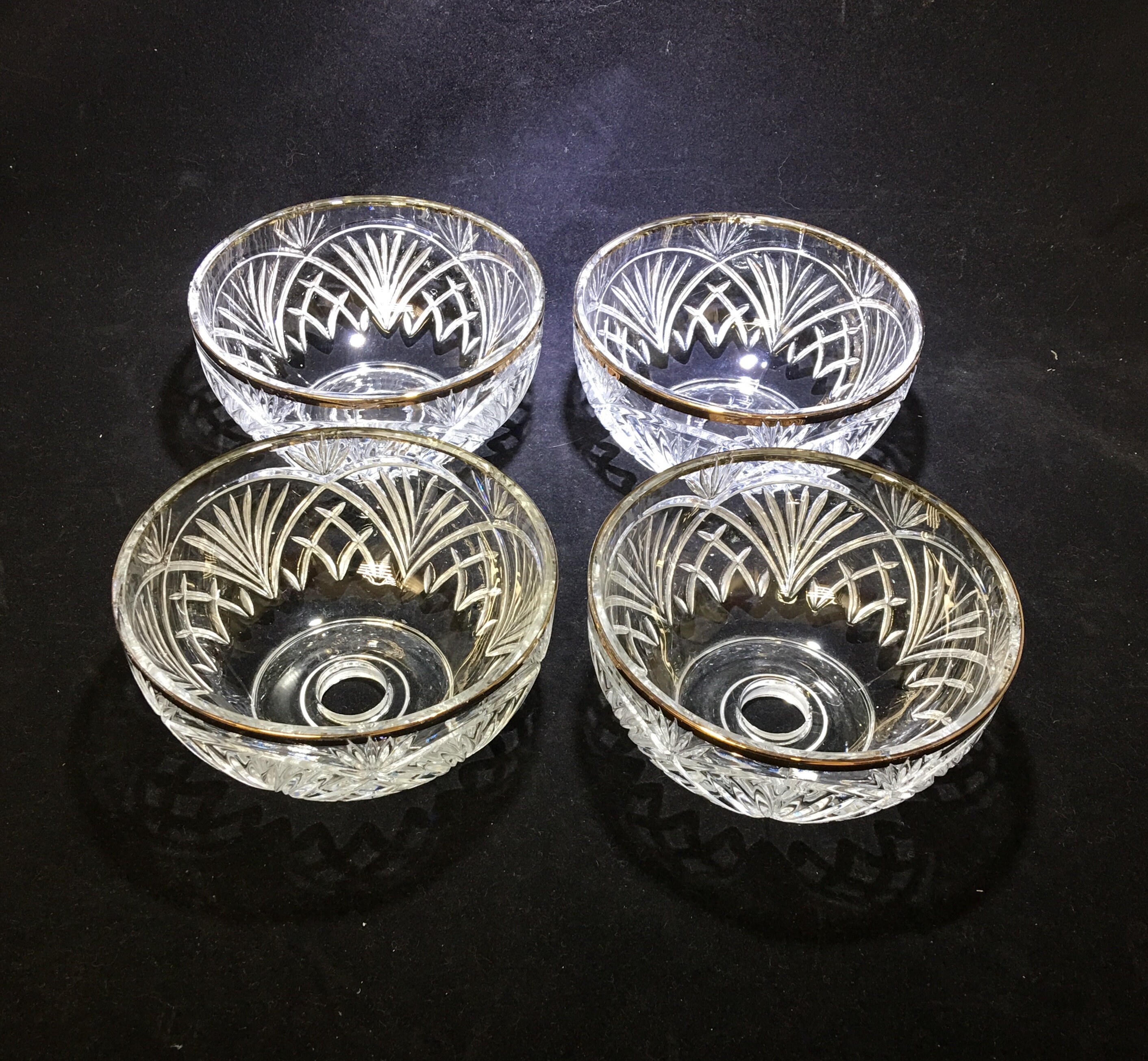 Set of 4 Vintage Cut Glass, Gold Trimmed Chandelier Half Globes. Lovely Fan and Cross design with hard to find 1" center opening (fitter) to accommodate chandelier base. Nicely weighted at a full 8 ounces each. Perfect addition to your antique hanging light. No chips or cracks.