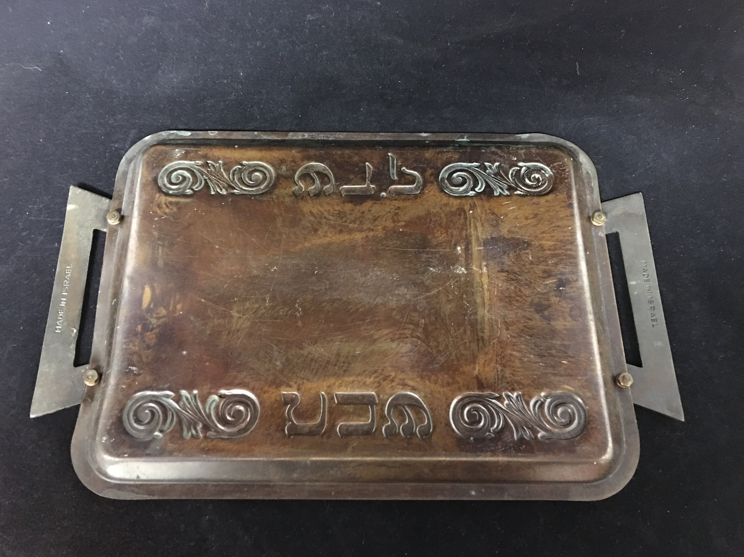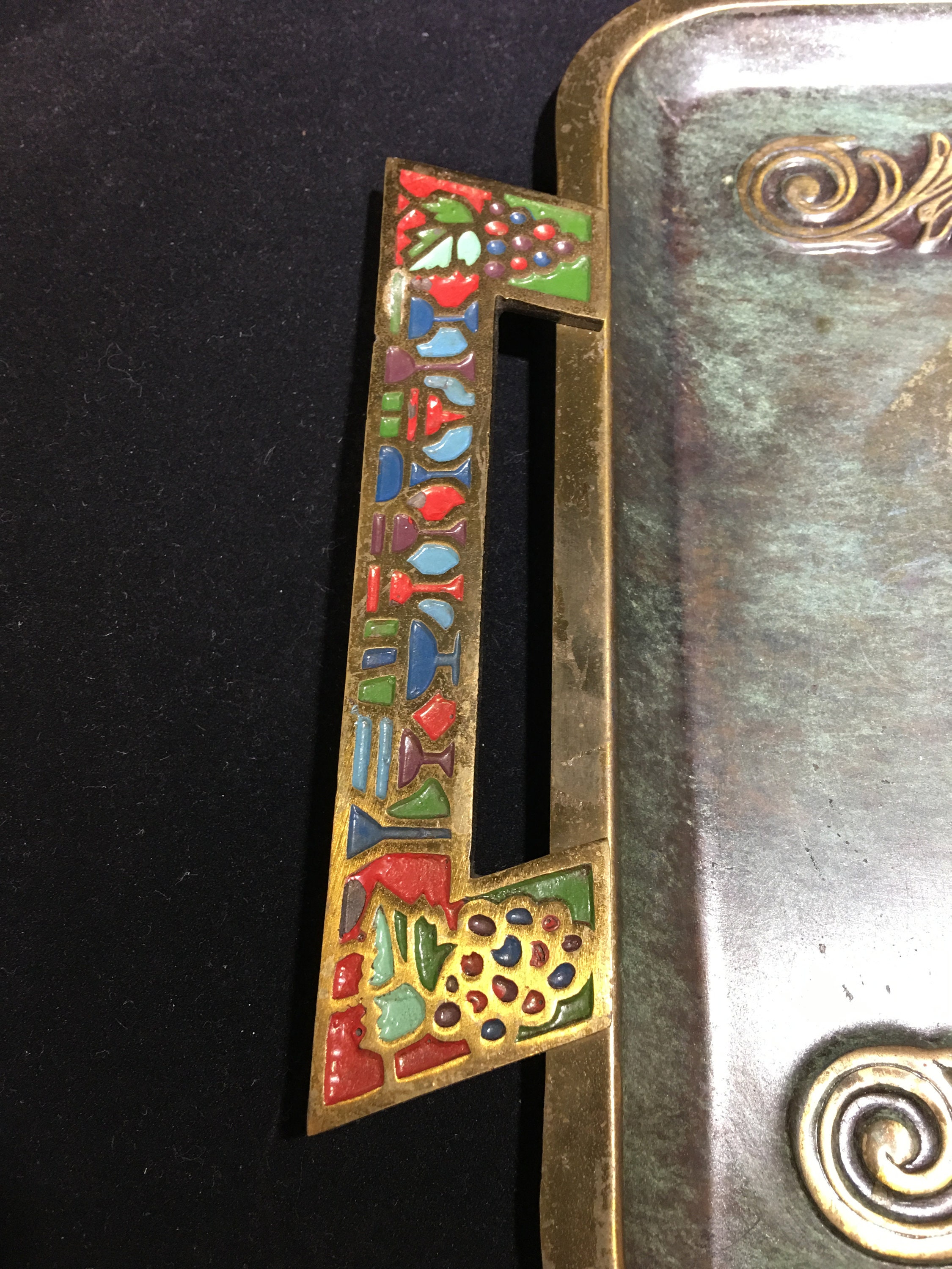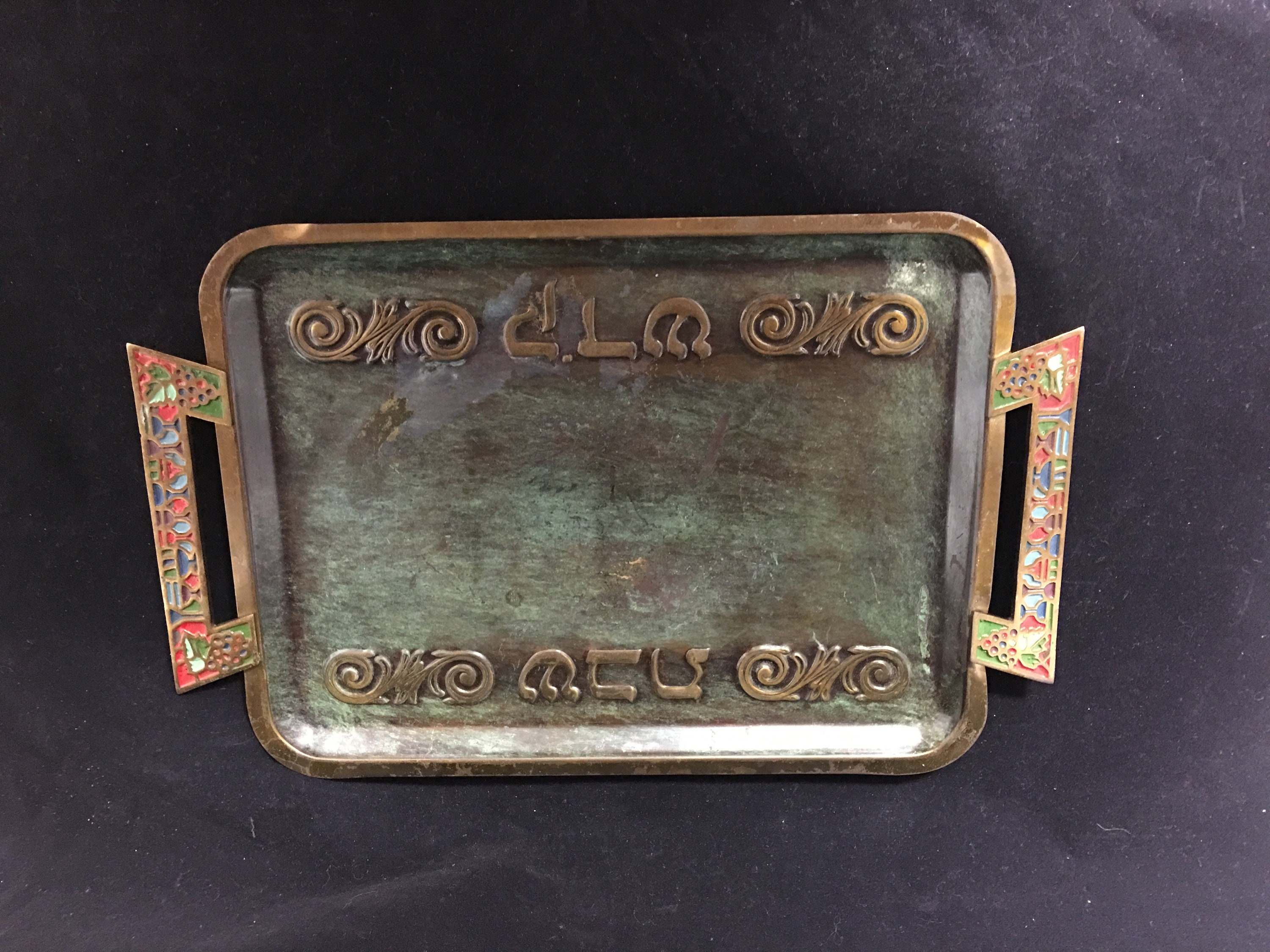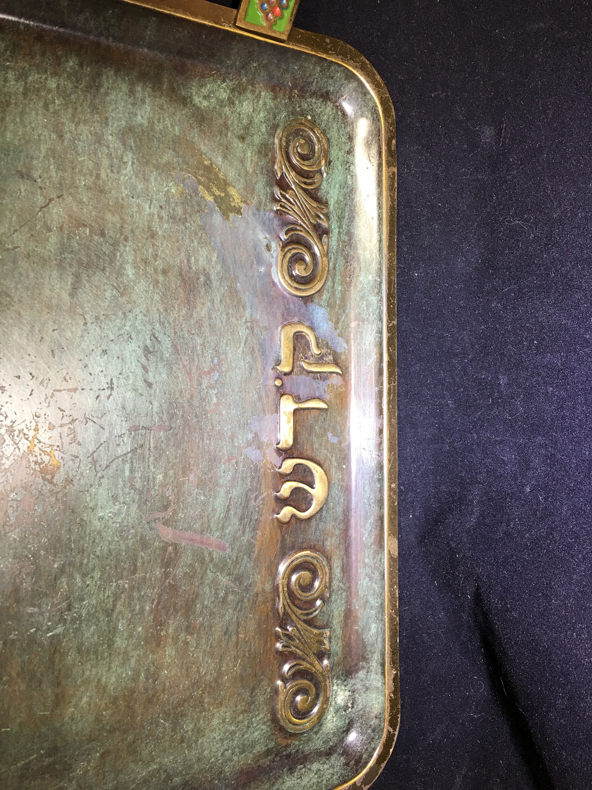 Beautiful Handcrafted Brass Challah Tray with Enamel Handles. Tray surface is washed with a green finish. Handles are finished in a vibrant enamel pattern. "Made in Israel" stamp on handle backs. Condition reflected in pricing. Front surface is worn and scratched from use. Small dives on tray edge. See photos. All-in-all, a very nice piece.