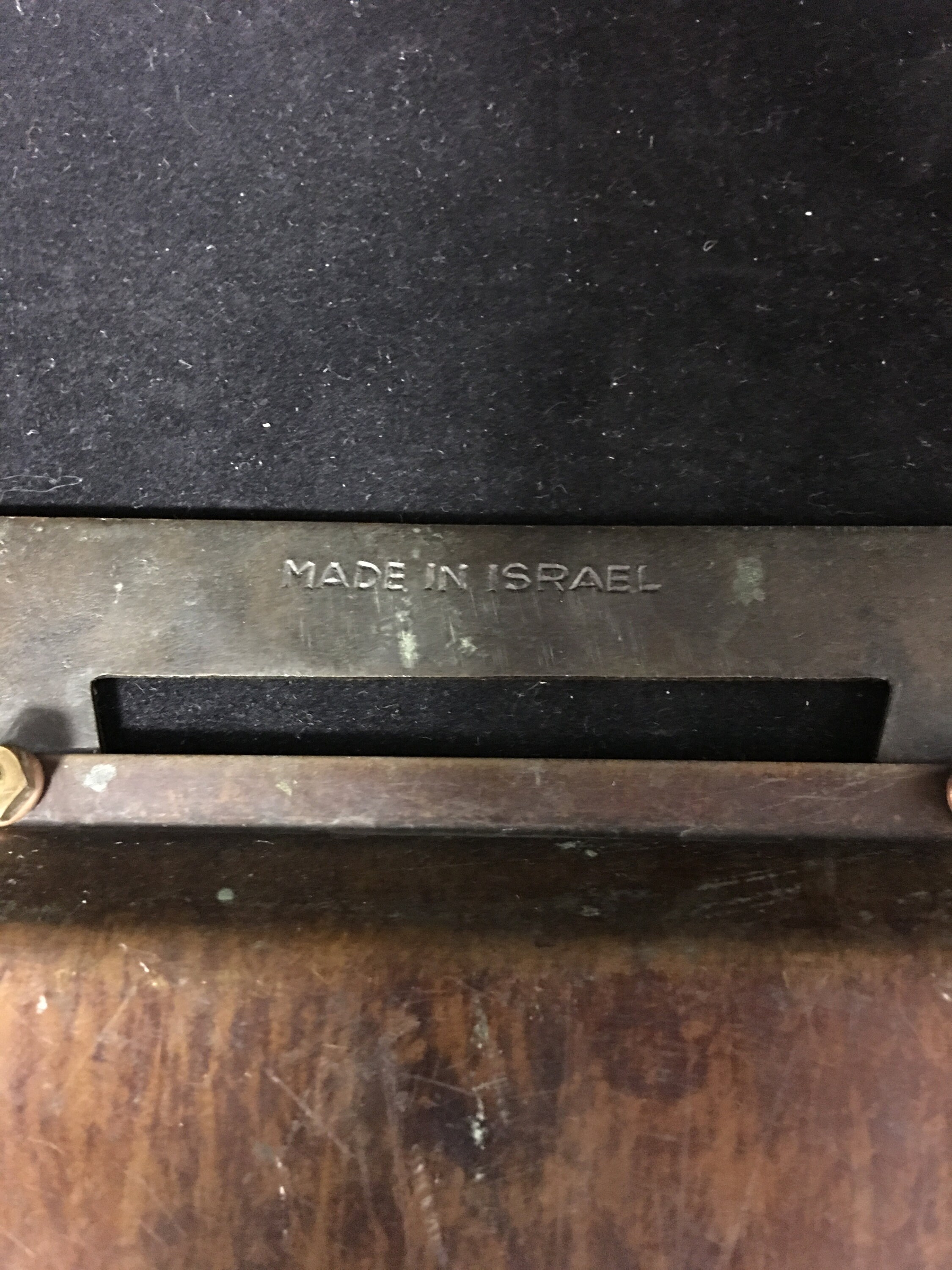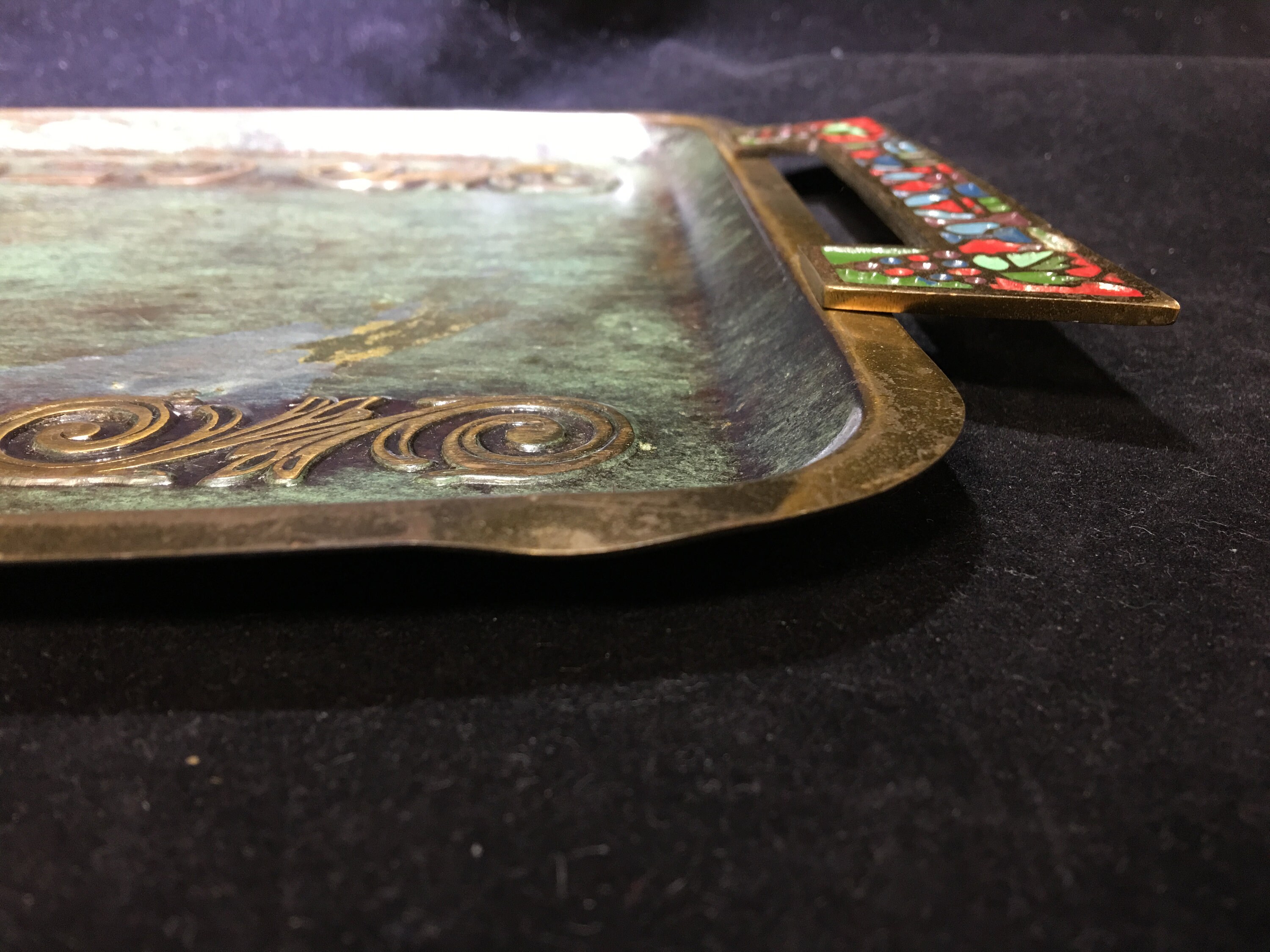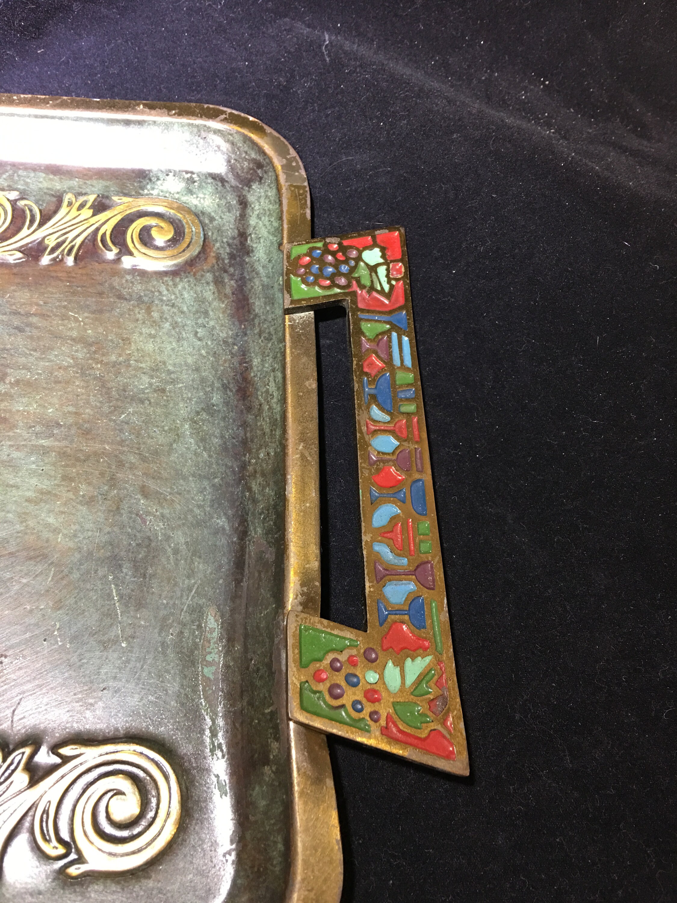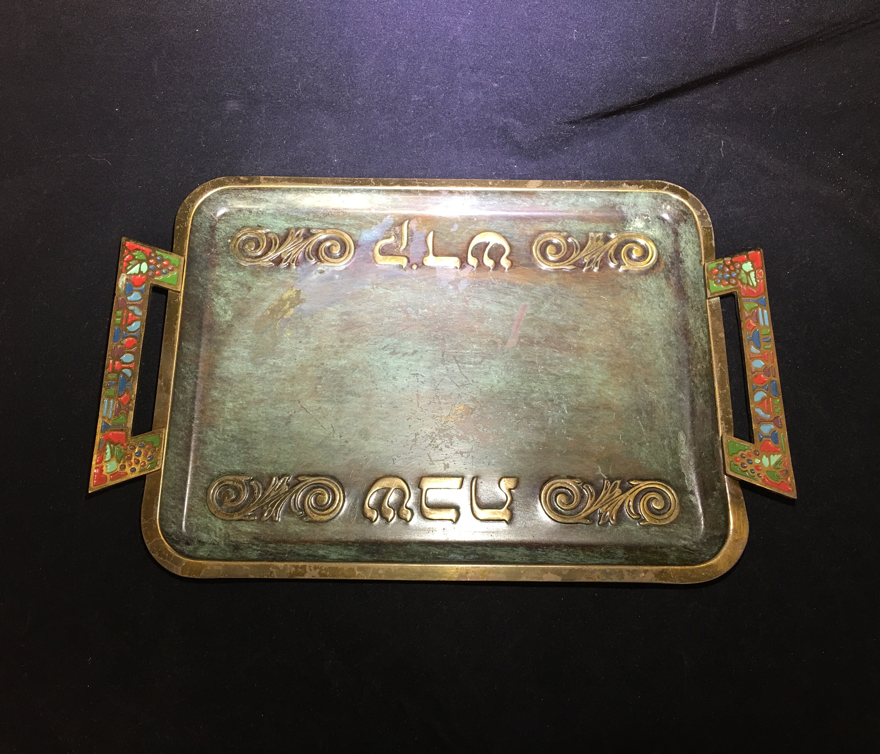 Beautiful Handcrafted Brass Challah Tray with Enamel Handles. Tray surface is washed with a green finish. Handles are finished in a vibrant enamel pattern. "Made in Israel" stamp on handle backs. Condition reflected in pricing. Front surface is worn and scratched from use. Small dives on tray edge. See photos. All-in-all, a very nice piece.