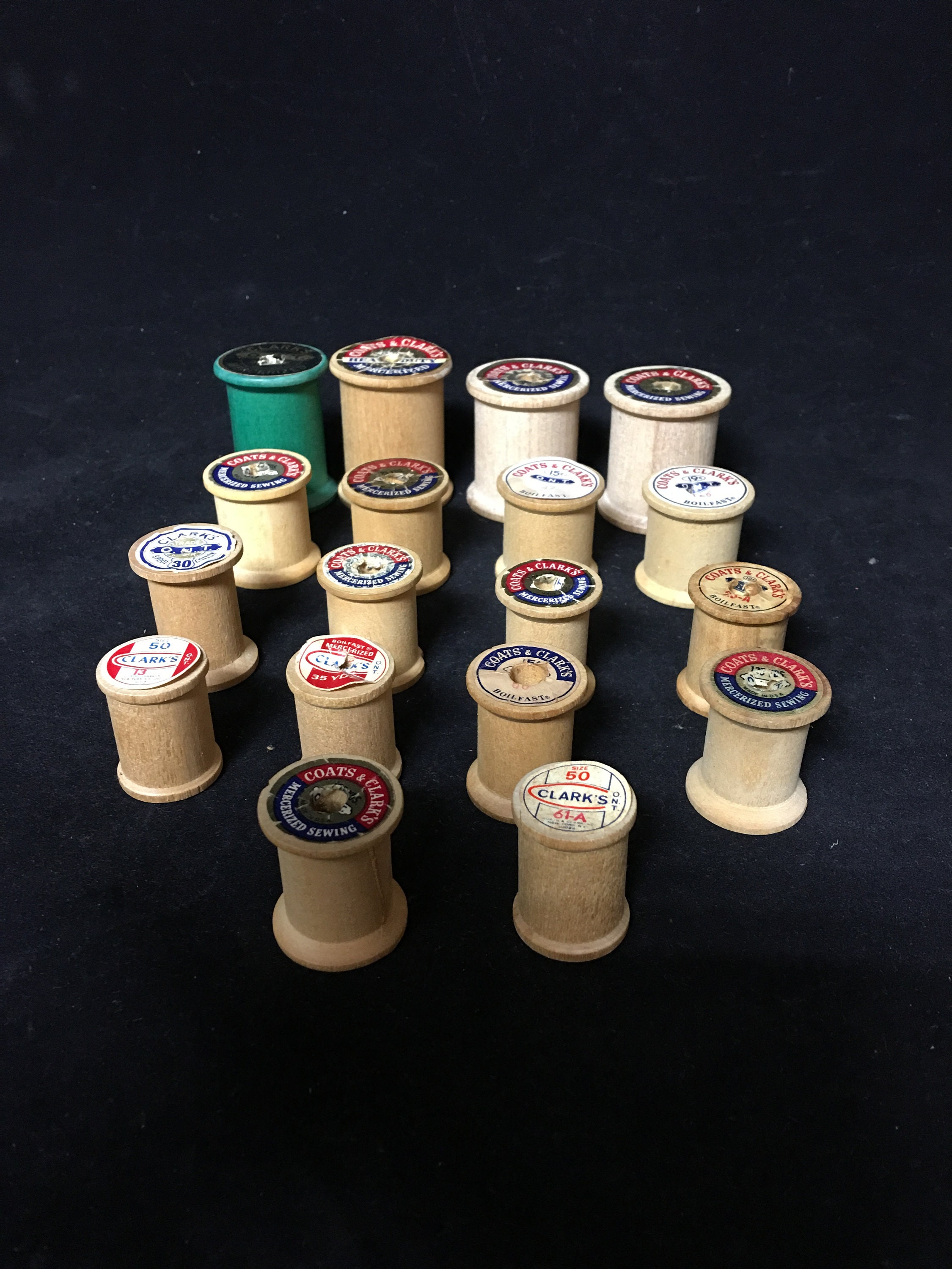 18 Vintage Coats & Clark's and Clark's Wooden Thread Spools of varying sizes. Each spool has at least one brand label. Please see photos for condition.