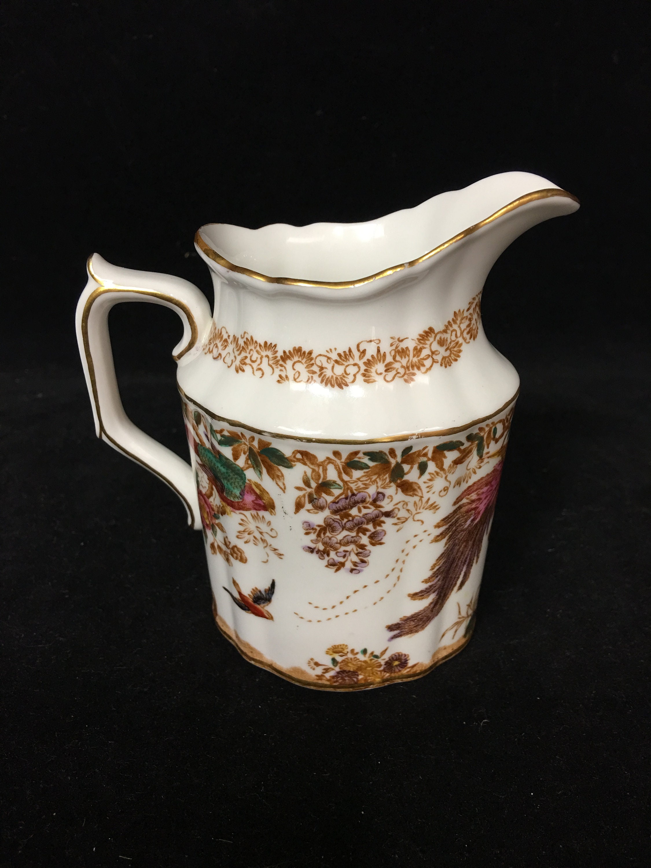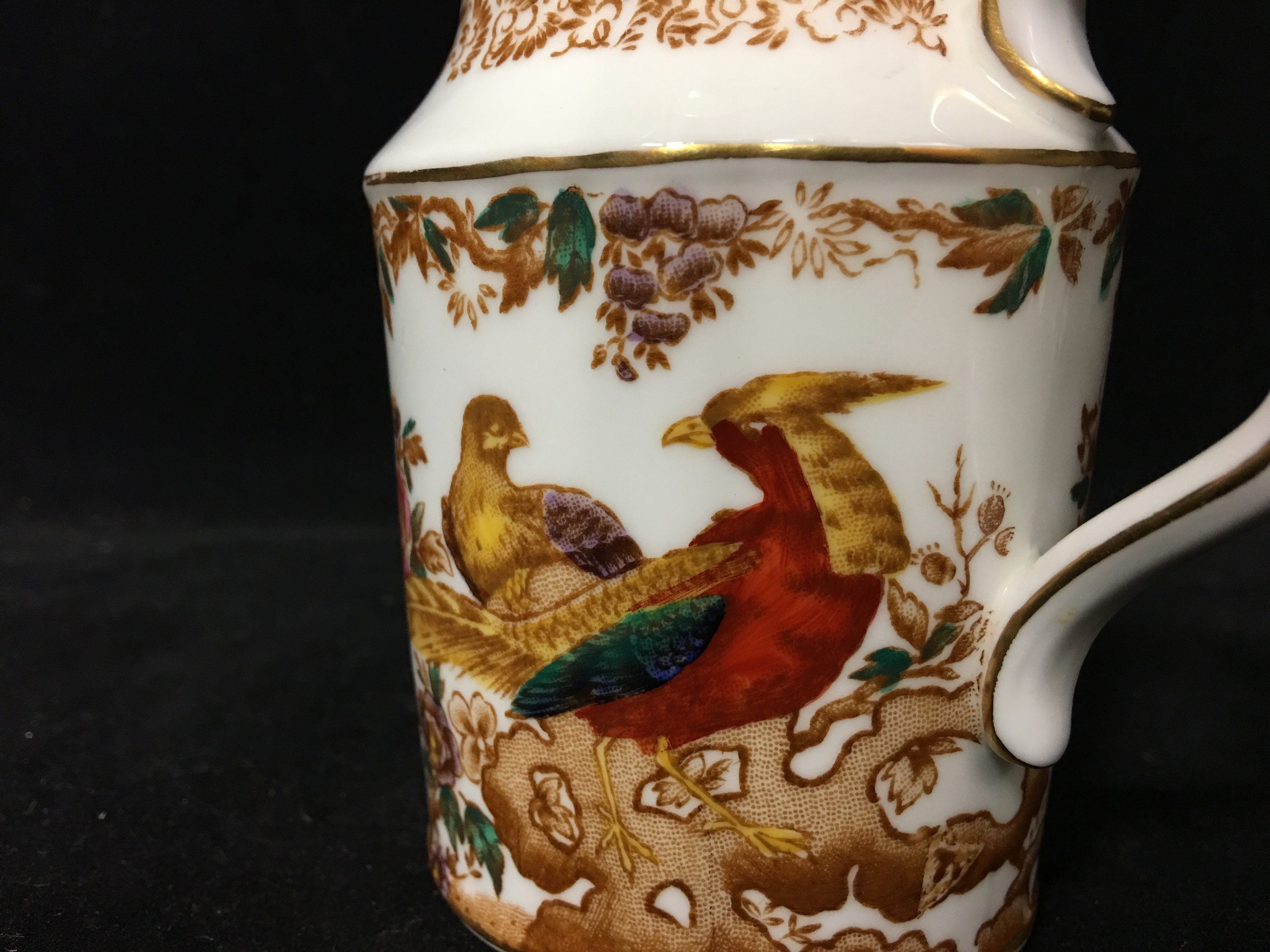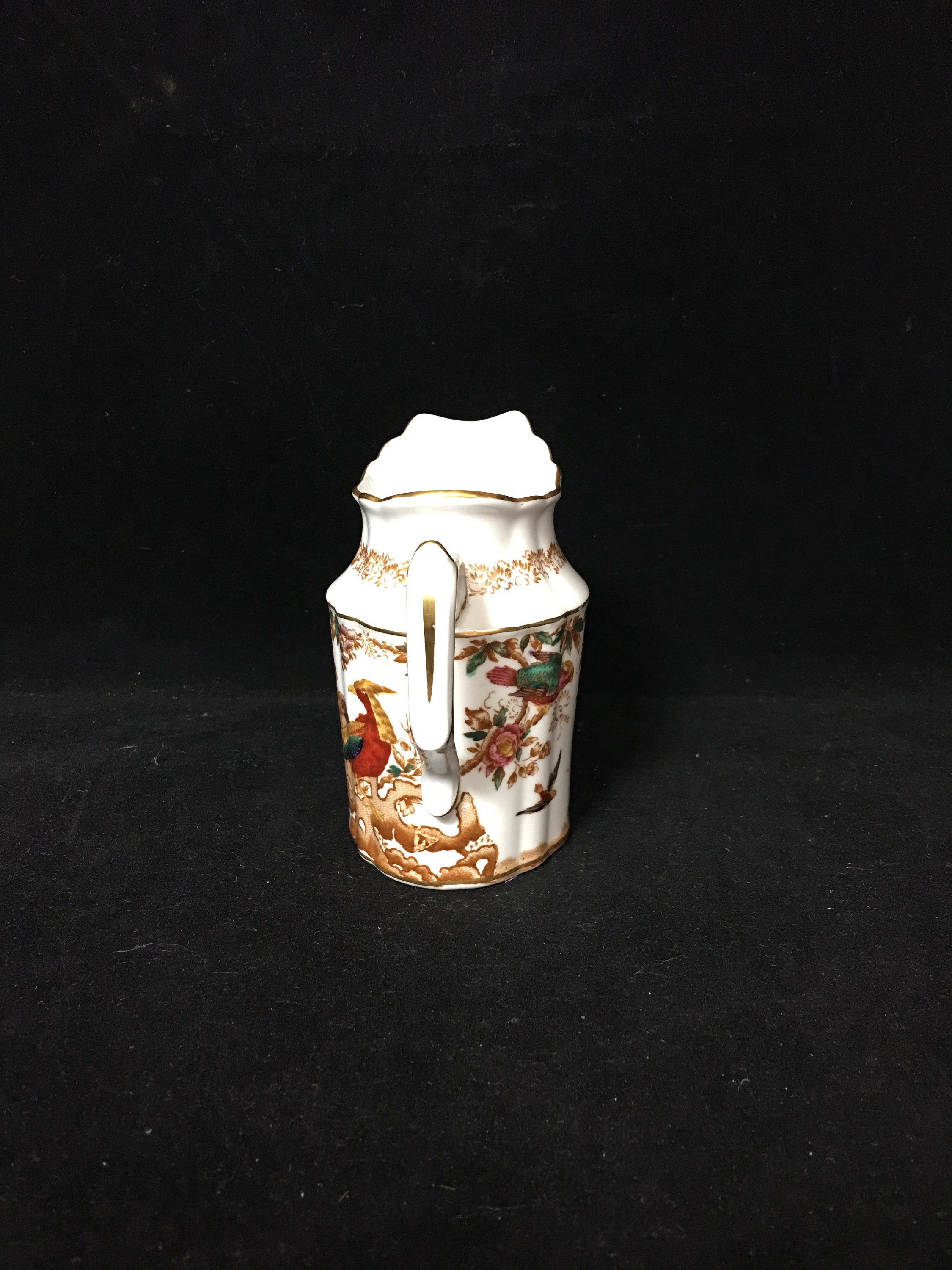 Beautiful vintage "Olde Avesbury" Derby China English Bone Creamer with scalloped gilded edges and handle featuring pheasants, birds, and florals. Maker's mark is clearly visible. Production #A.73 XXXIII (33). Free of chips, cracks and crazing. Very clean interior; ready for use.