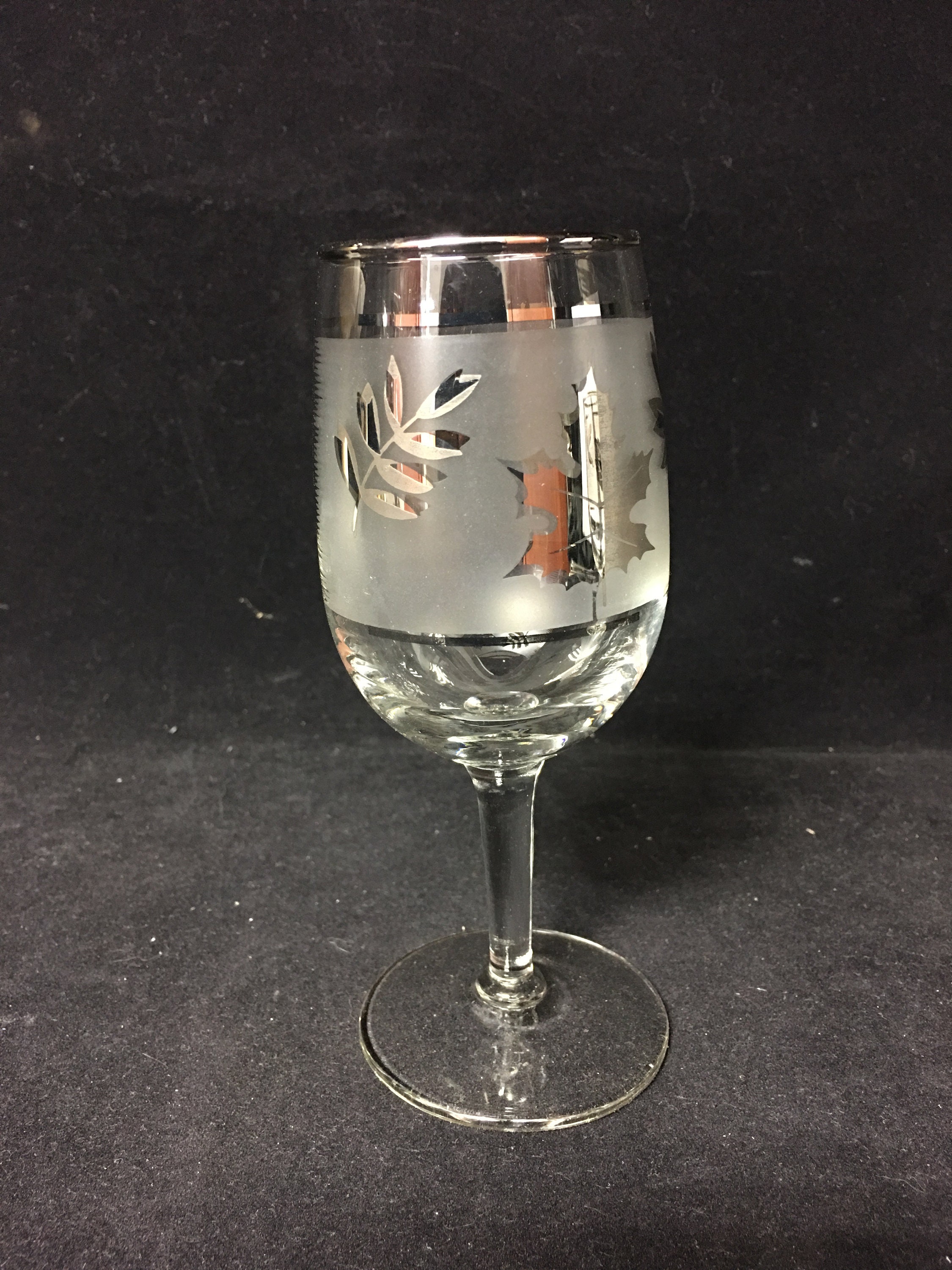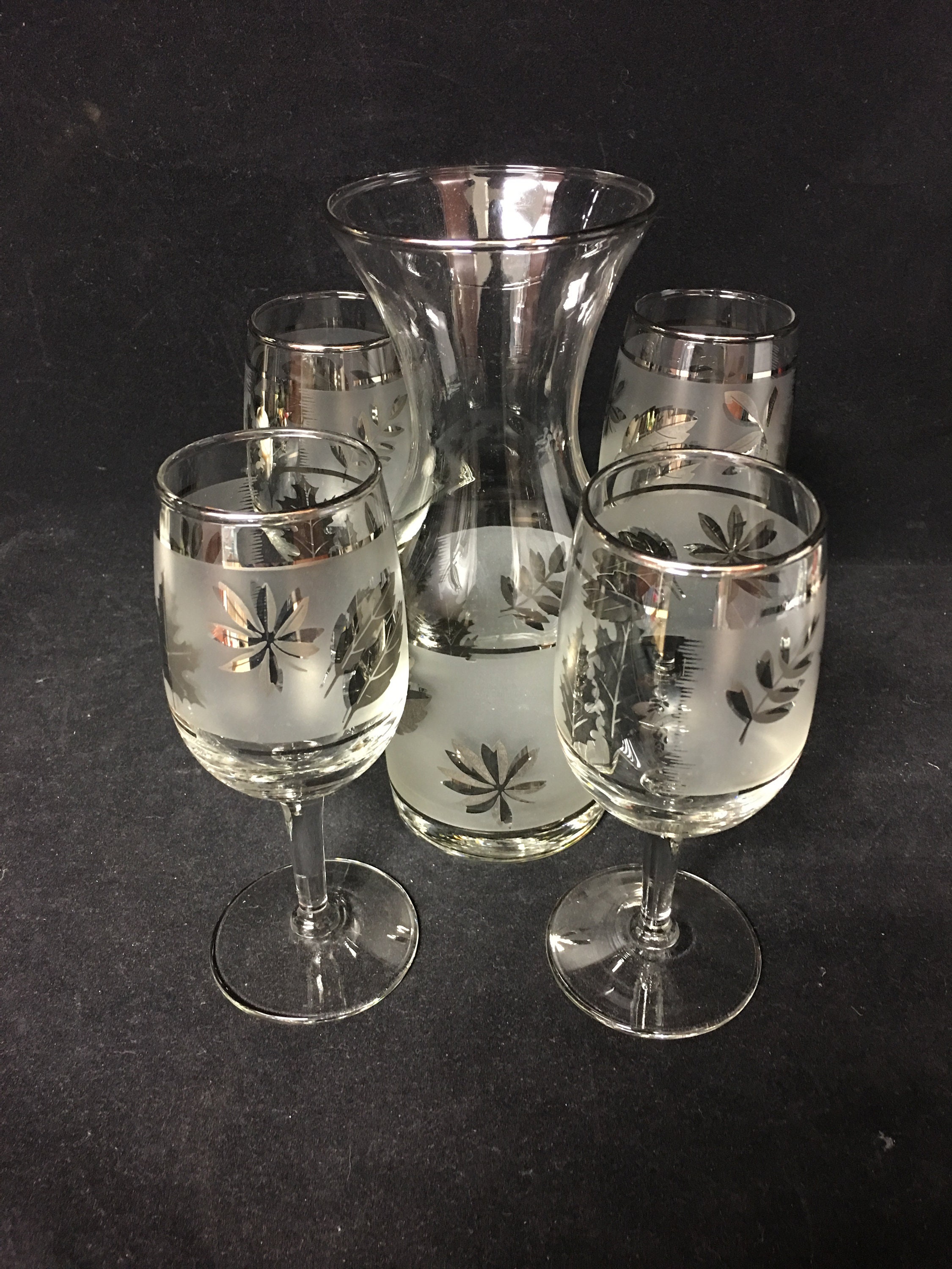 Nice Libby Glass silver Foliage Wine Carafe Sete consisting of (1) Carafe and (4) glasses. Frosted bands with silver leaves and silver trim. Near new condition. Free of chips or cracks.