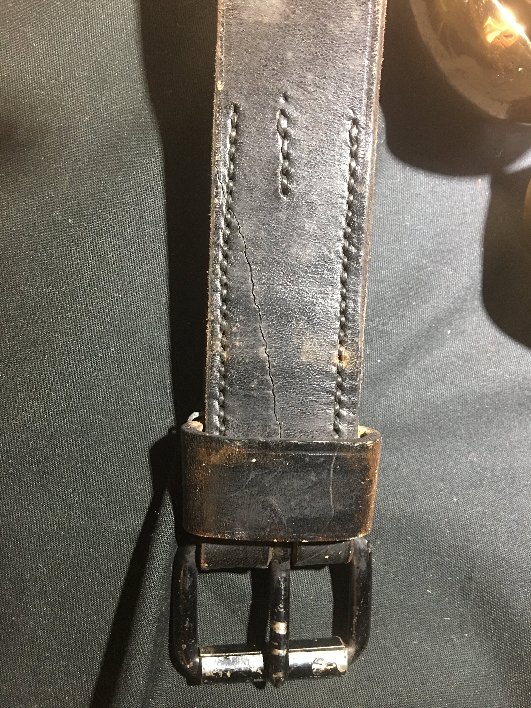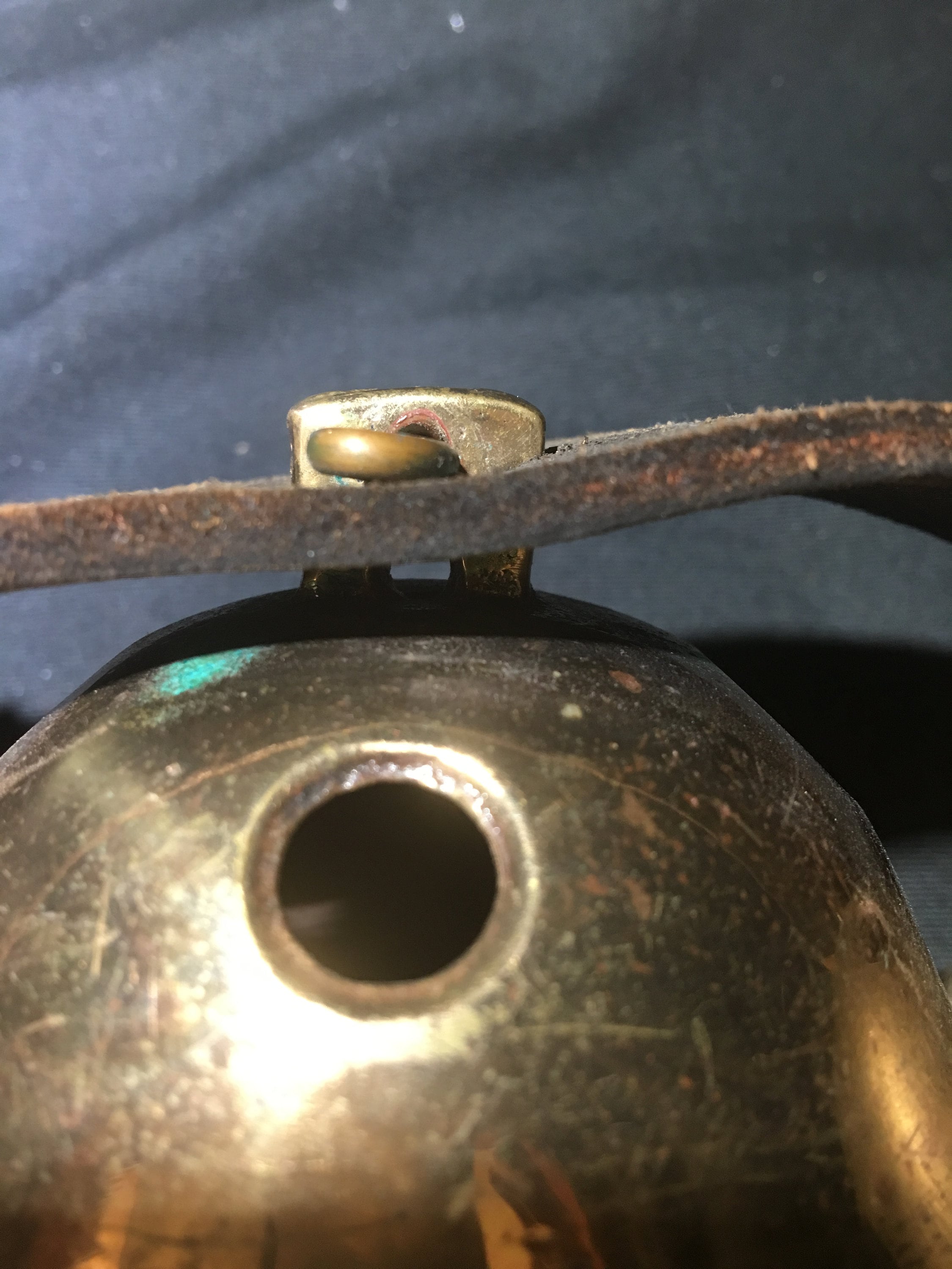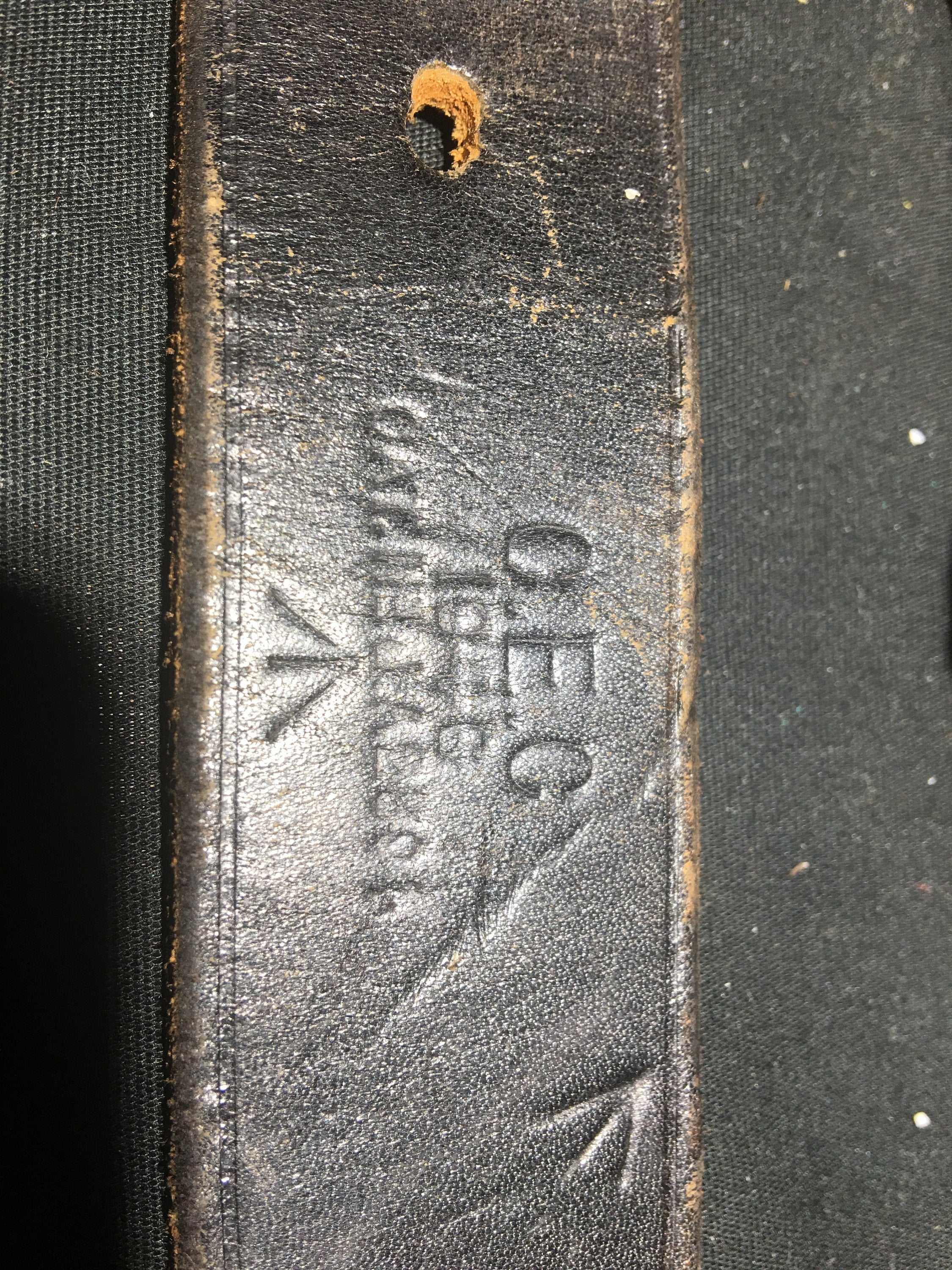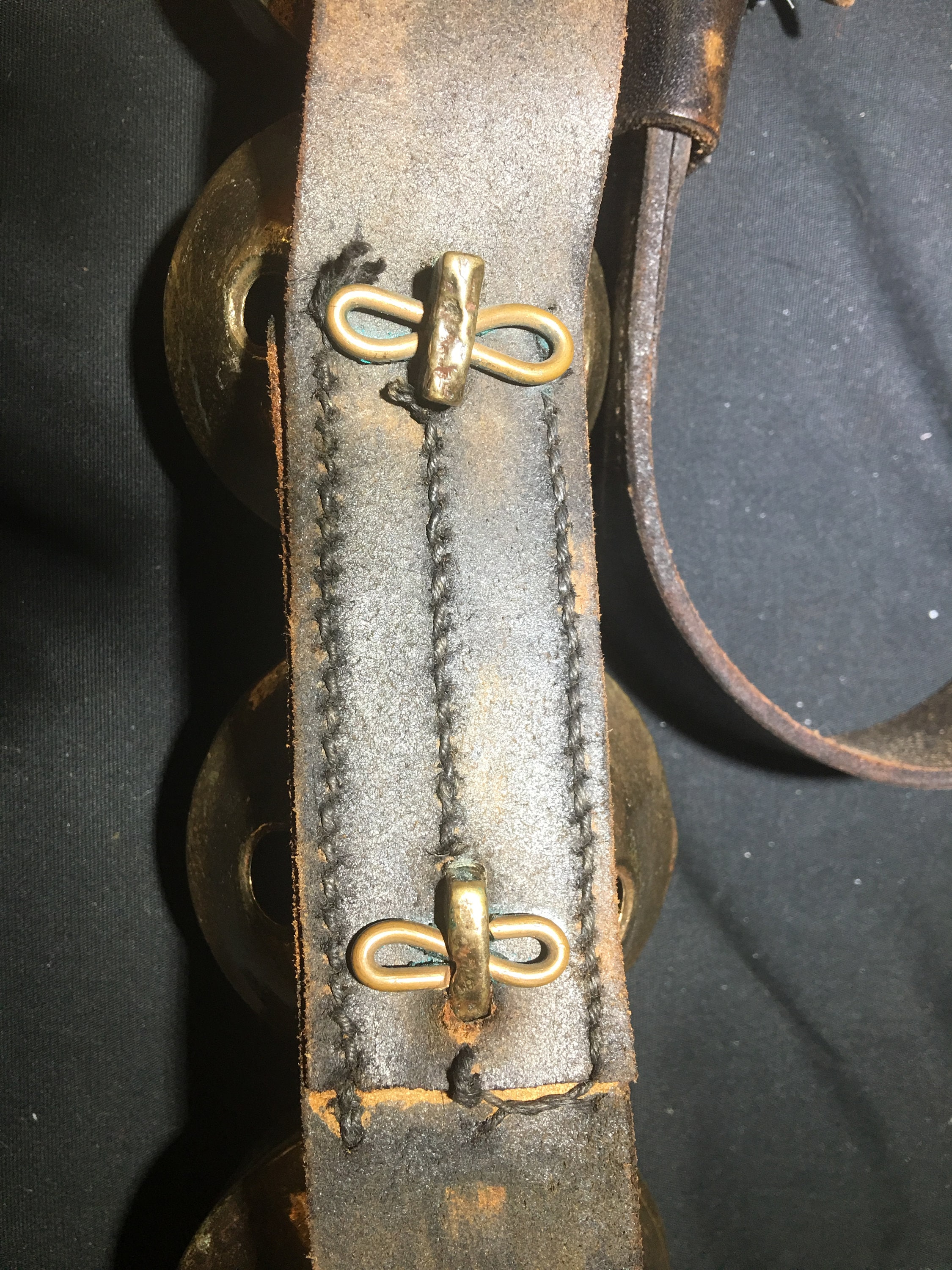 Antique horse (sleigh) bells - 88"L with 24 early pedal bells. 20 bells are numbered, 4 are unnumbered. Leather is stamped with early catalog number and date (1840s). Age authenticated by pedal bell shank design (U shaped) and pins and throat slit circular-ends. Leather strap construction is two pieces, stitching style consistent with age. See photos for more details. Good condition for age. Neither bells nor strap have been cleaned or restored.