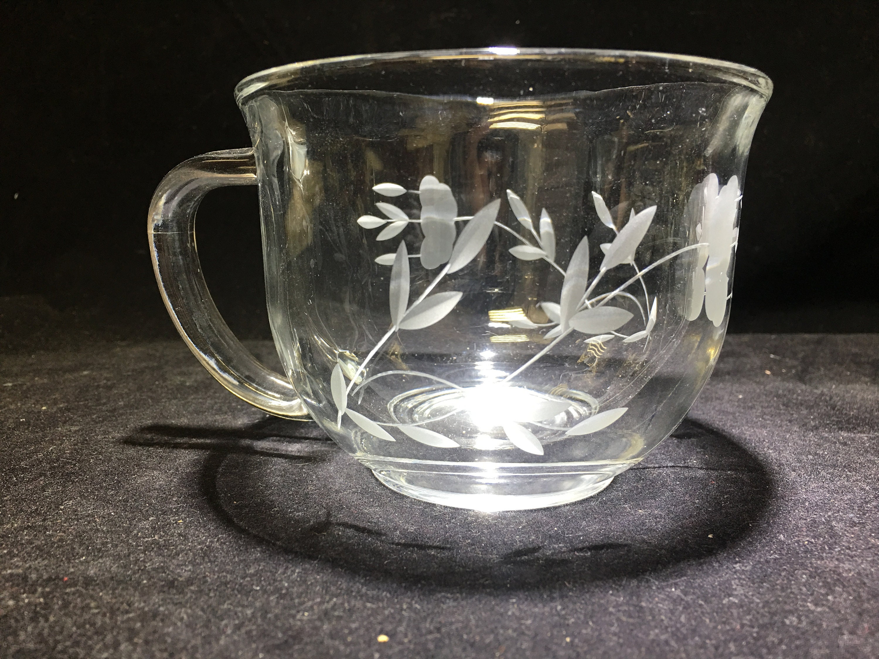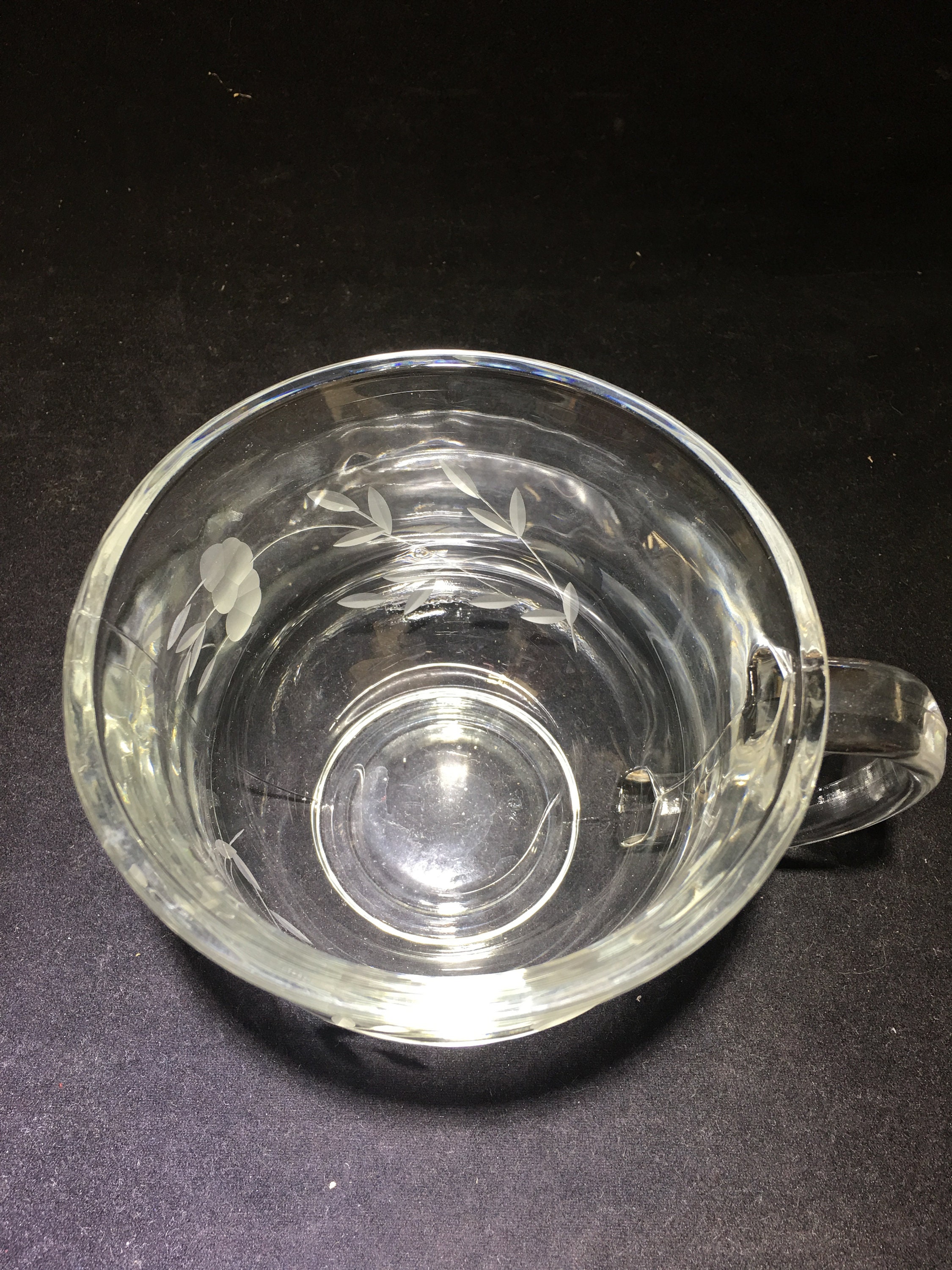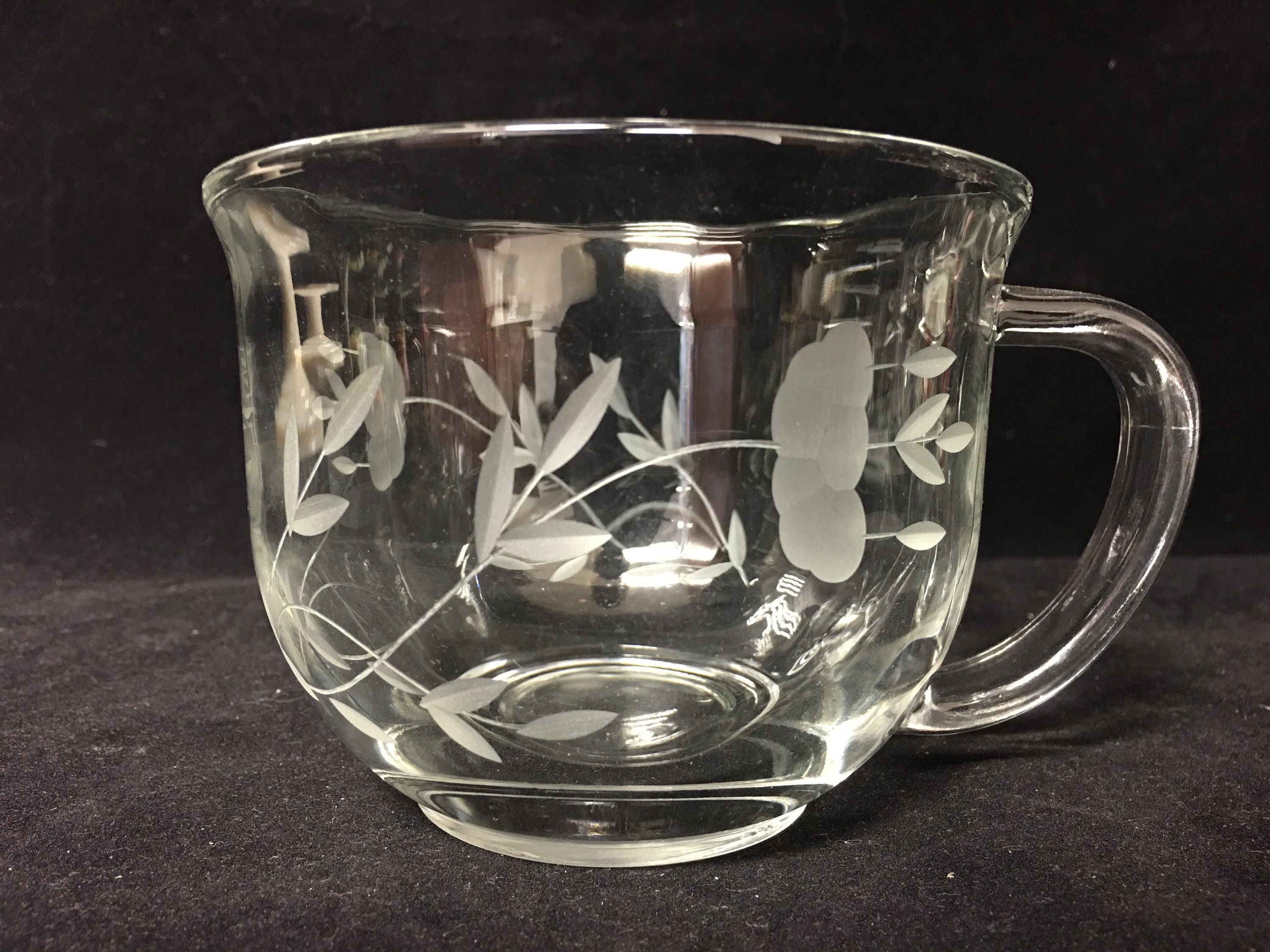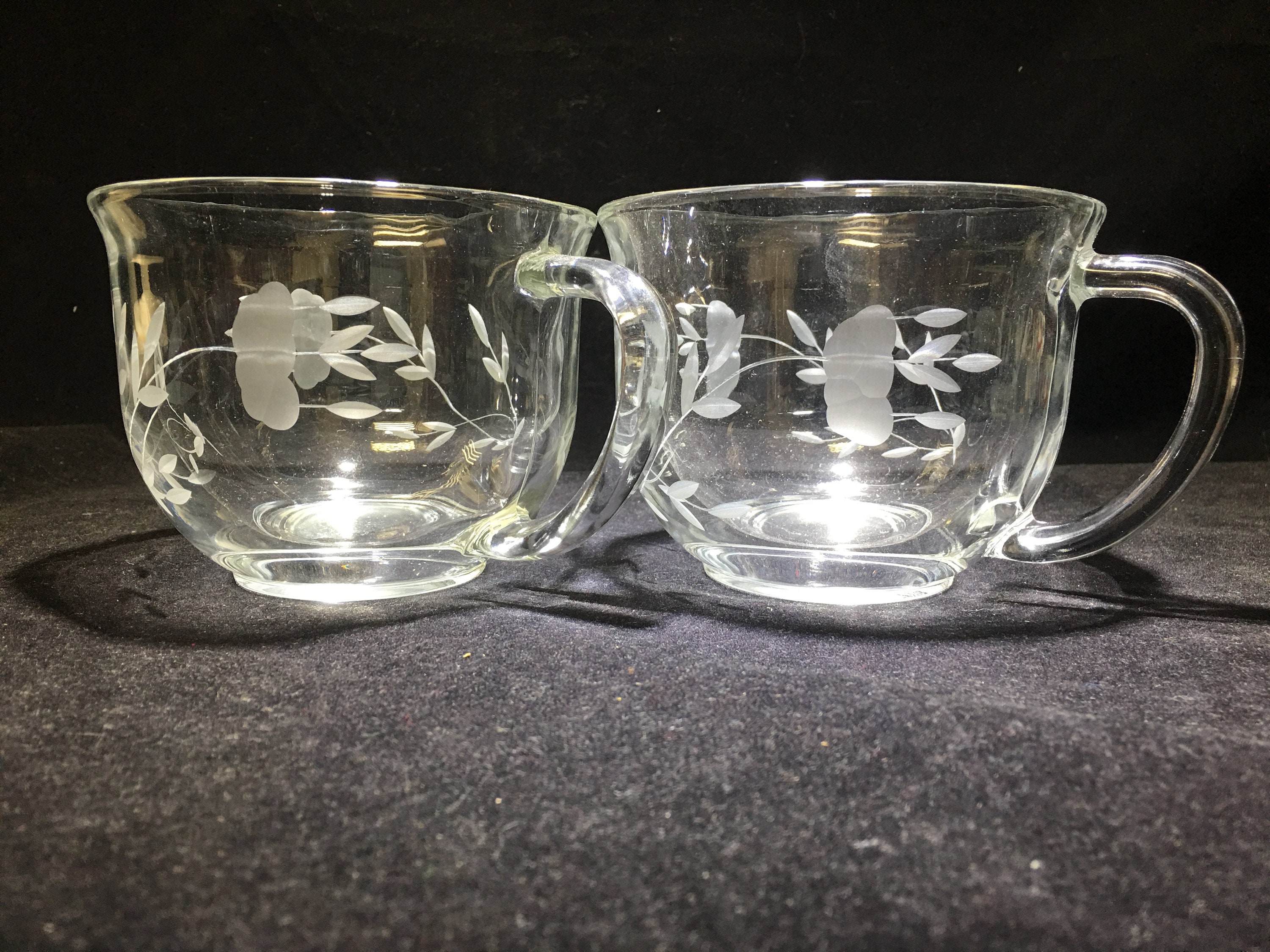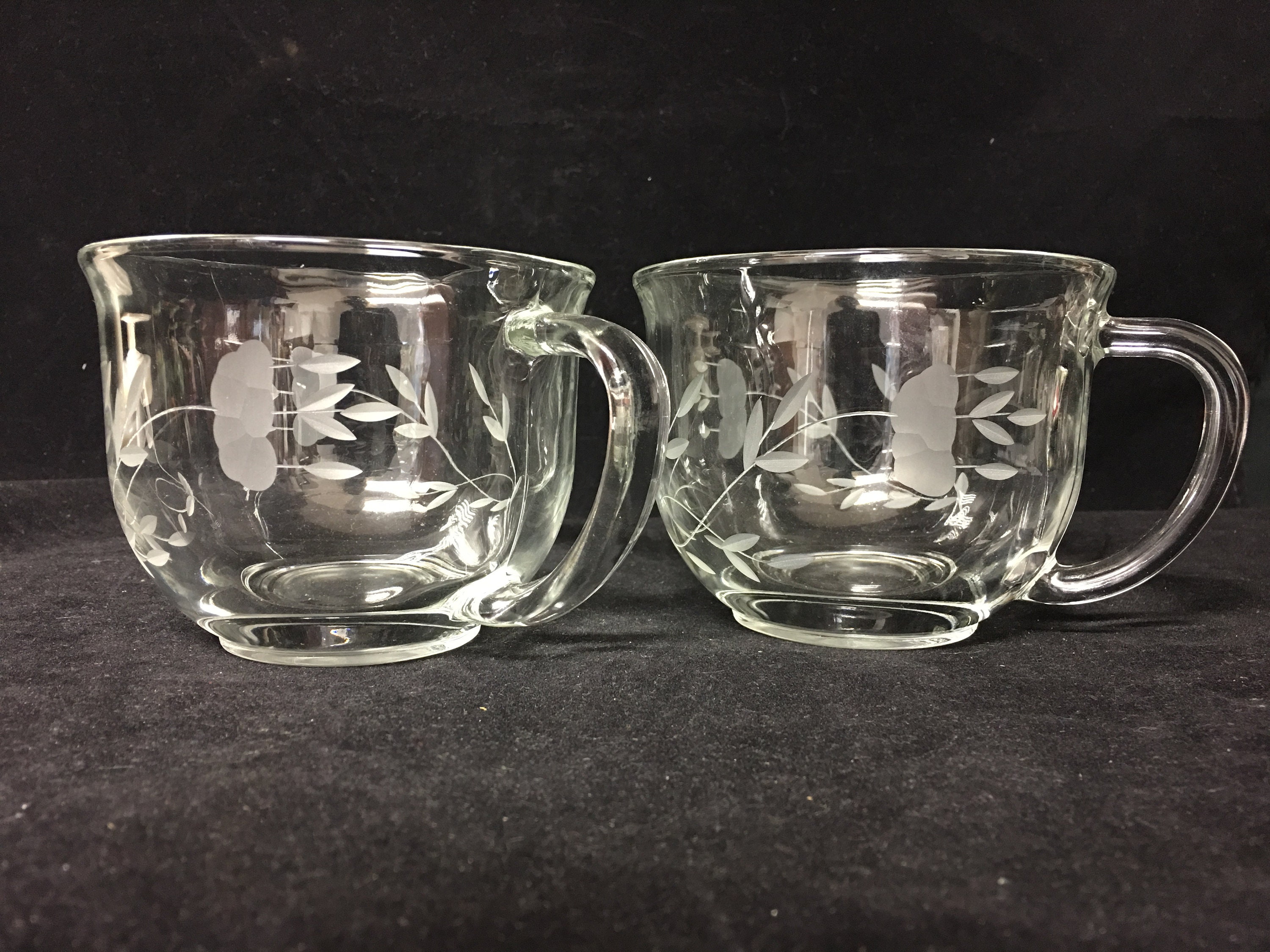 Hard to find Princess House Crystal Heritage Cappuccino / Soup Mugs (2). Beautifully etched with the Heritage pattern. Nicely weighted crystal. Free of chips and cracks.