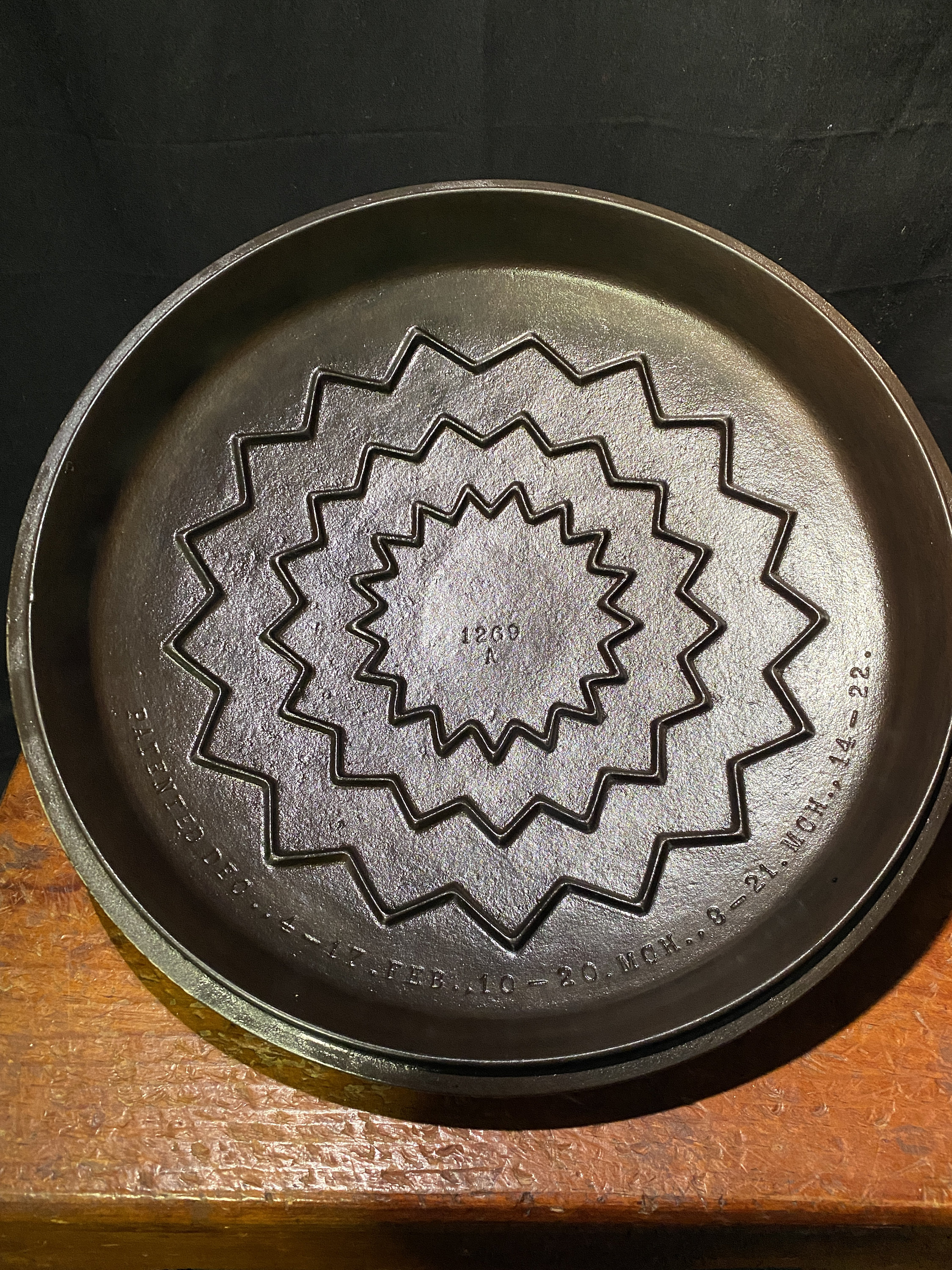 The lid is just spectacular. The inside of the lid reads "1269 A" and "PATENTED DEC..4-17. FEB..10-20. MCH.. 8-26. MCH.. 14-22."